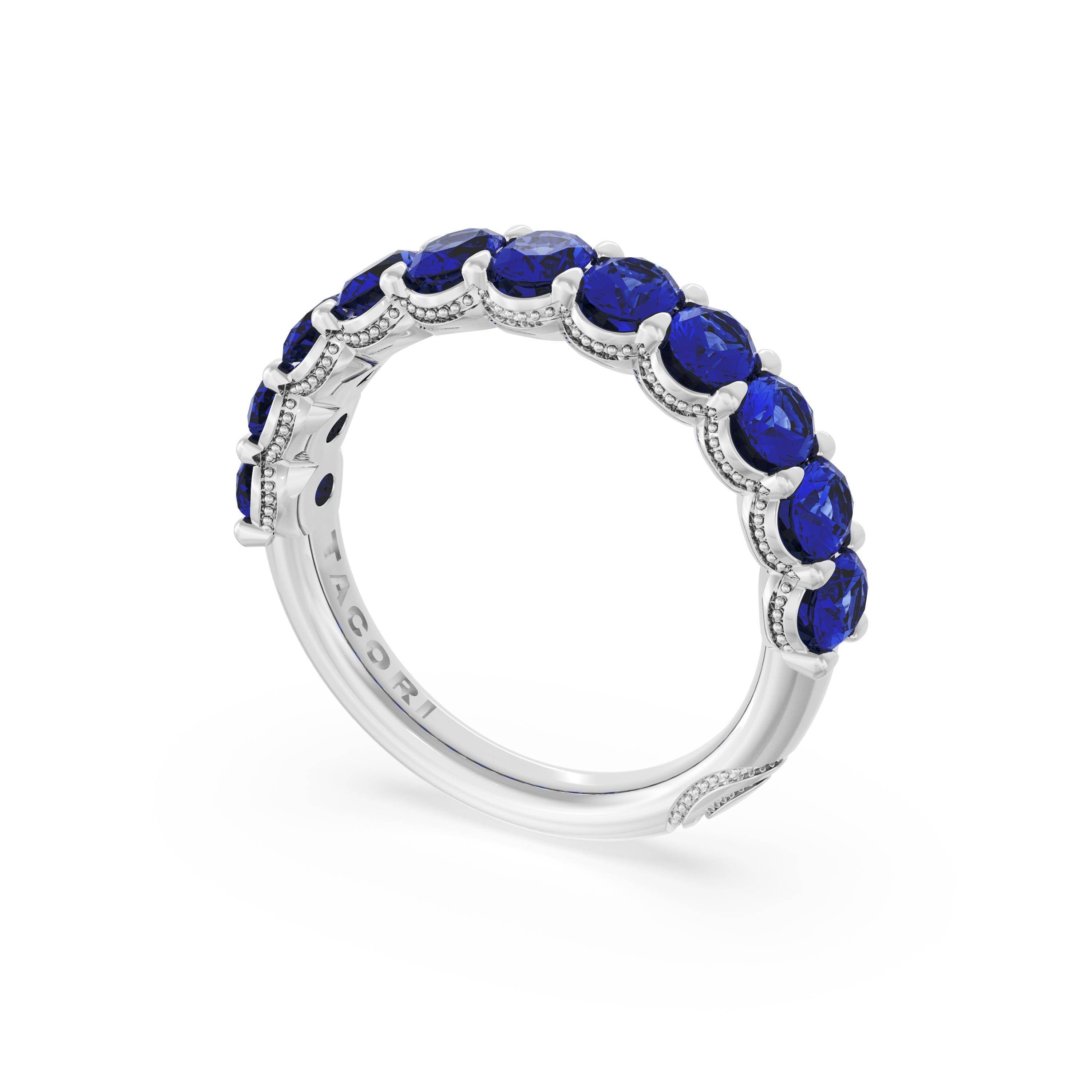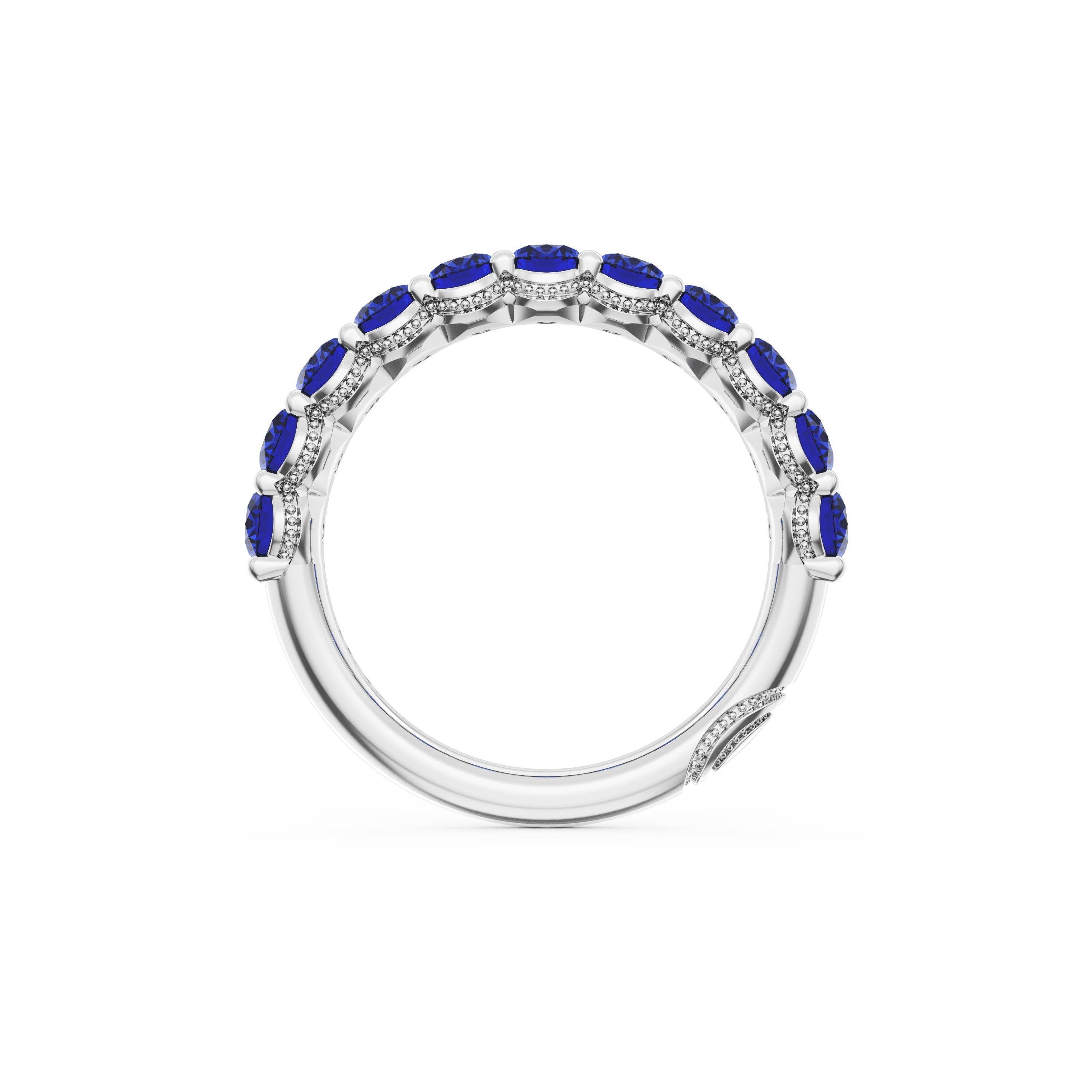 Oval cut blue sapphires decorate the ceiling of this Platinum band and milgrain adds intricate texture to the silhouette.