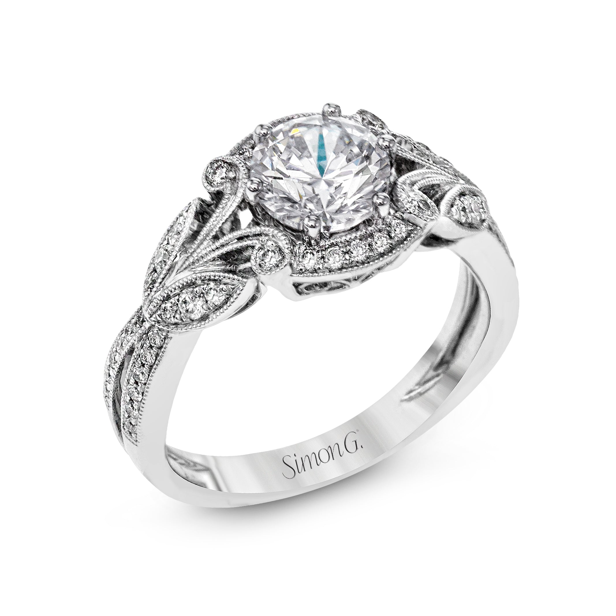 This amazing engagement ring features vintage-inspired design elements and is set with brilliant white diamonds.