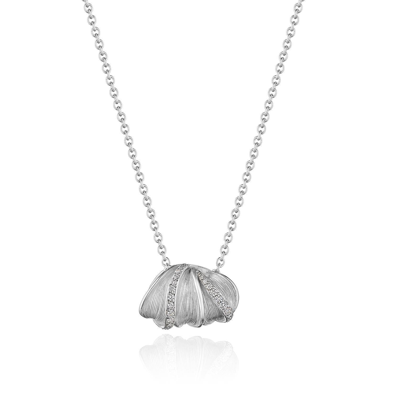 "Crafted in 18k white gold, this petal-inspired pendant features three overlapping leaves with fluid engravings and delicate pavé accents"