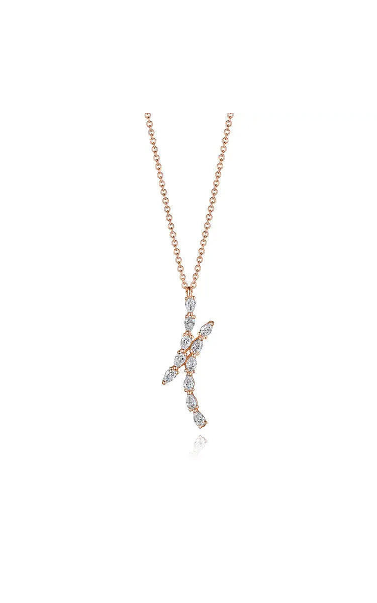 Passing strings of pear cut diamonds hang gracefully from a delicate 18k Rose Gold. Milgrain-accented TACORI Crescents decorate the silhouette of each stone.