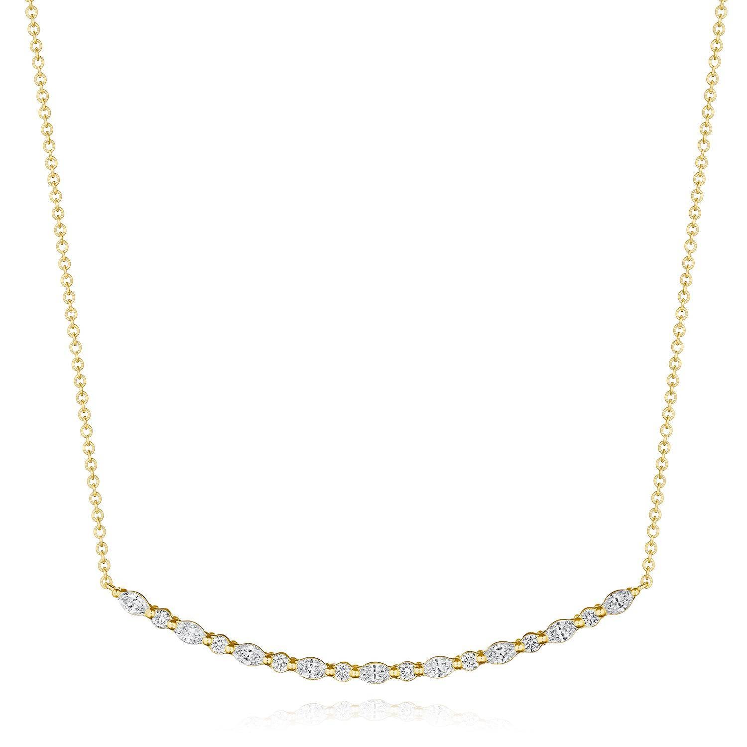 A delicate string of marquise and round brilliant cut diamonds hangs from a chain of 18k Yellow Gold. The silhouette of each stone is embellished with milgrain-accented TACORI Crescents.