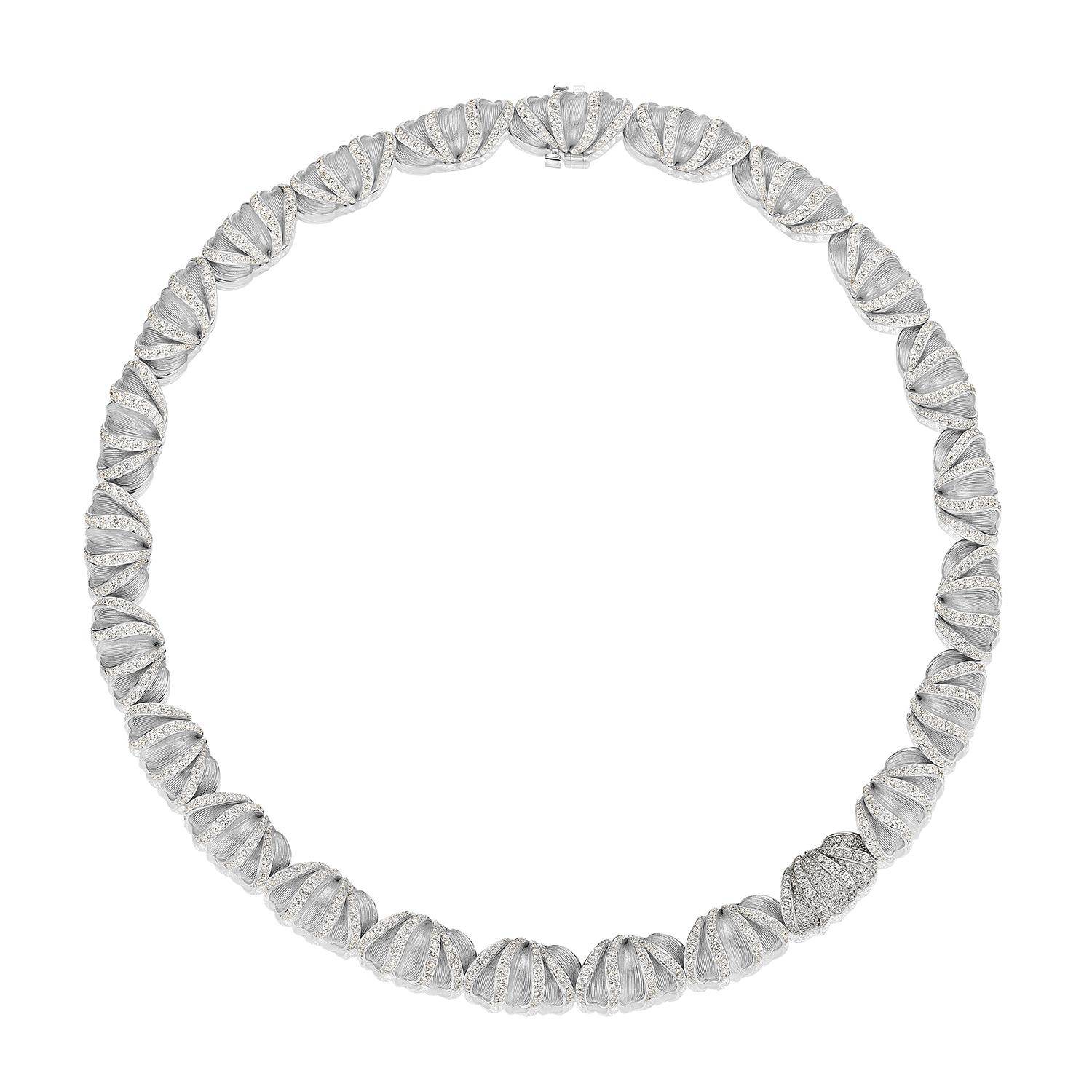 "Crafted in 18k yellow gold, this necklace features triple-petal links, each fully encrusted in pavé for continuous brilliance all around."