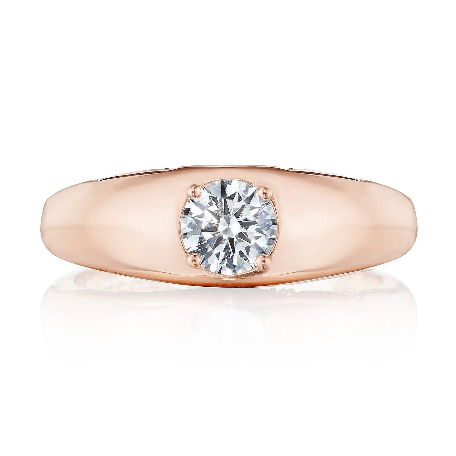 "Solid 18k gold is expertly crafted into a sleek, domed ring that enthralls a mined diamond center. The high polish finish lends a striking and alluring contrast to the bezel-inspired piece, while a hidden TACORI Crescent adds dimension."