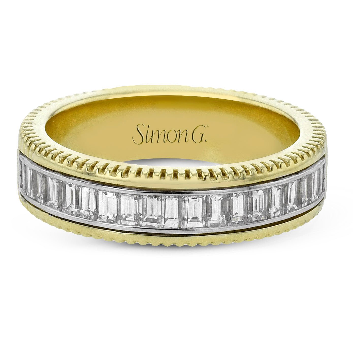 This two-tone right hand ring sparkles with a row of baguette diamonds accented by a delicate beaded edge.