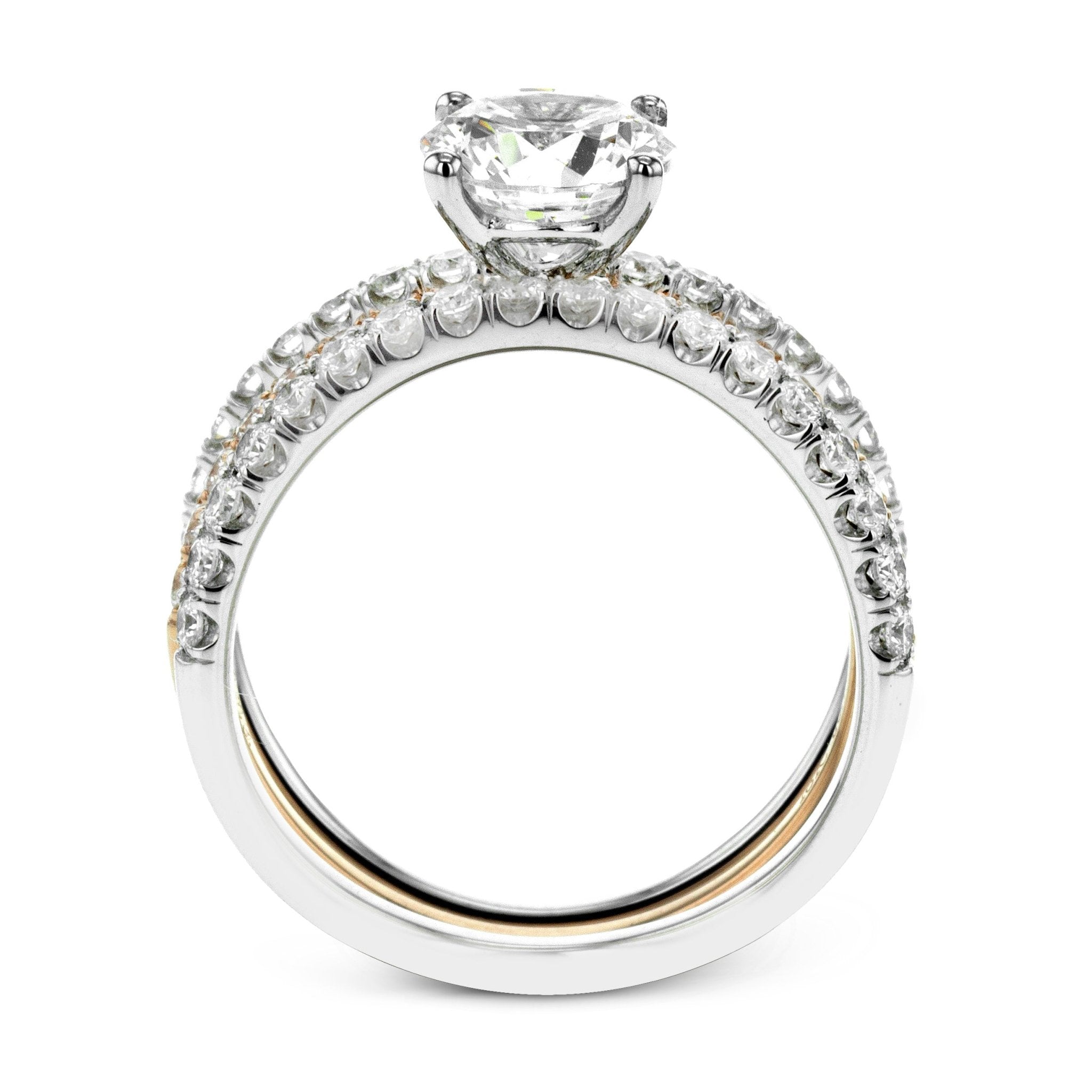 This distinctive bridal set design offers a double-layer wedding band that fits around the engagement ring and is set with brilliant white diamonds.