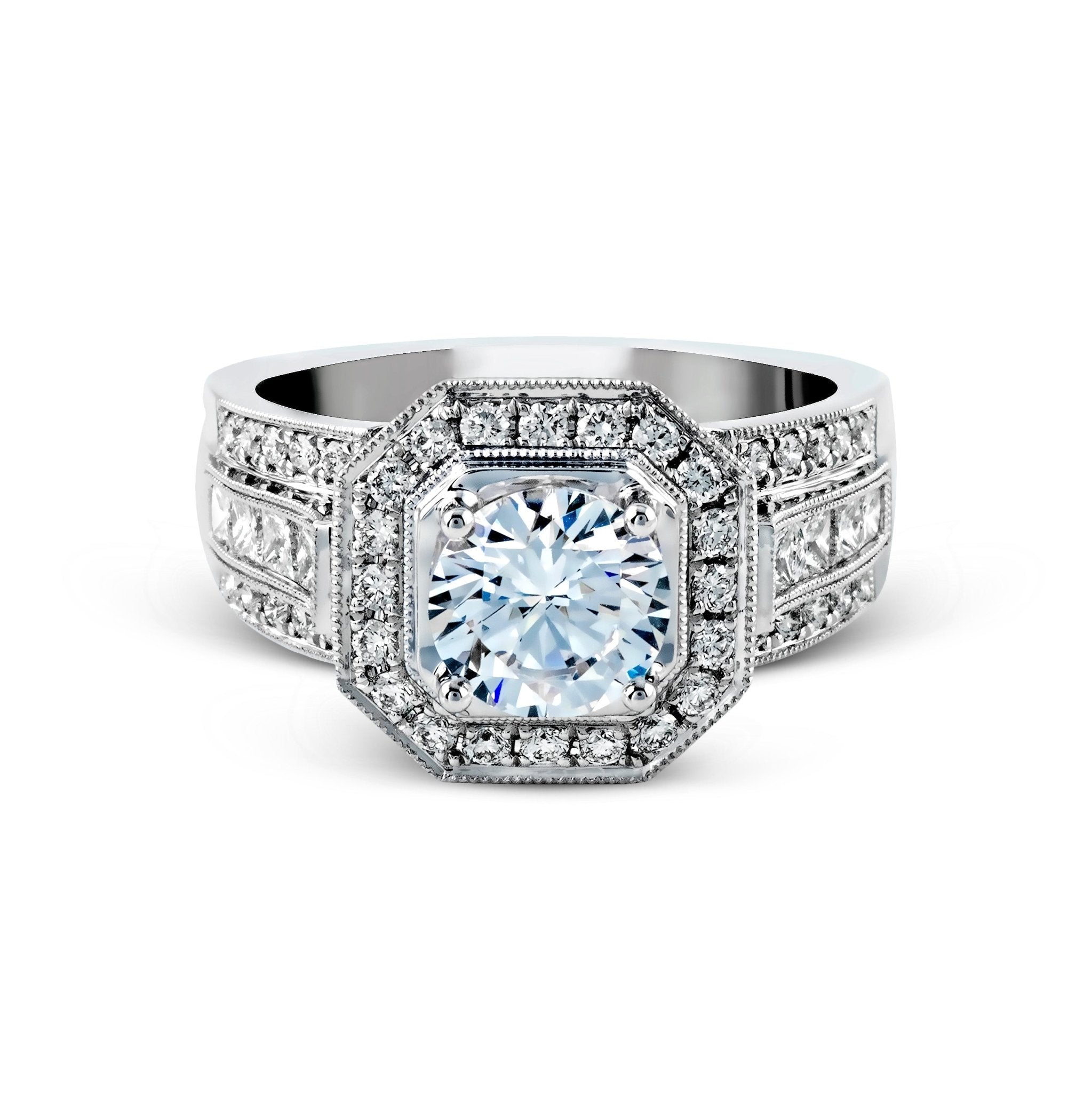 This stunning ring features an impressive, modern design set with a brilliant combination of sparkling round and princess diamonds.