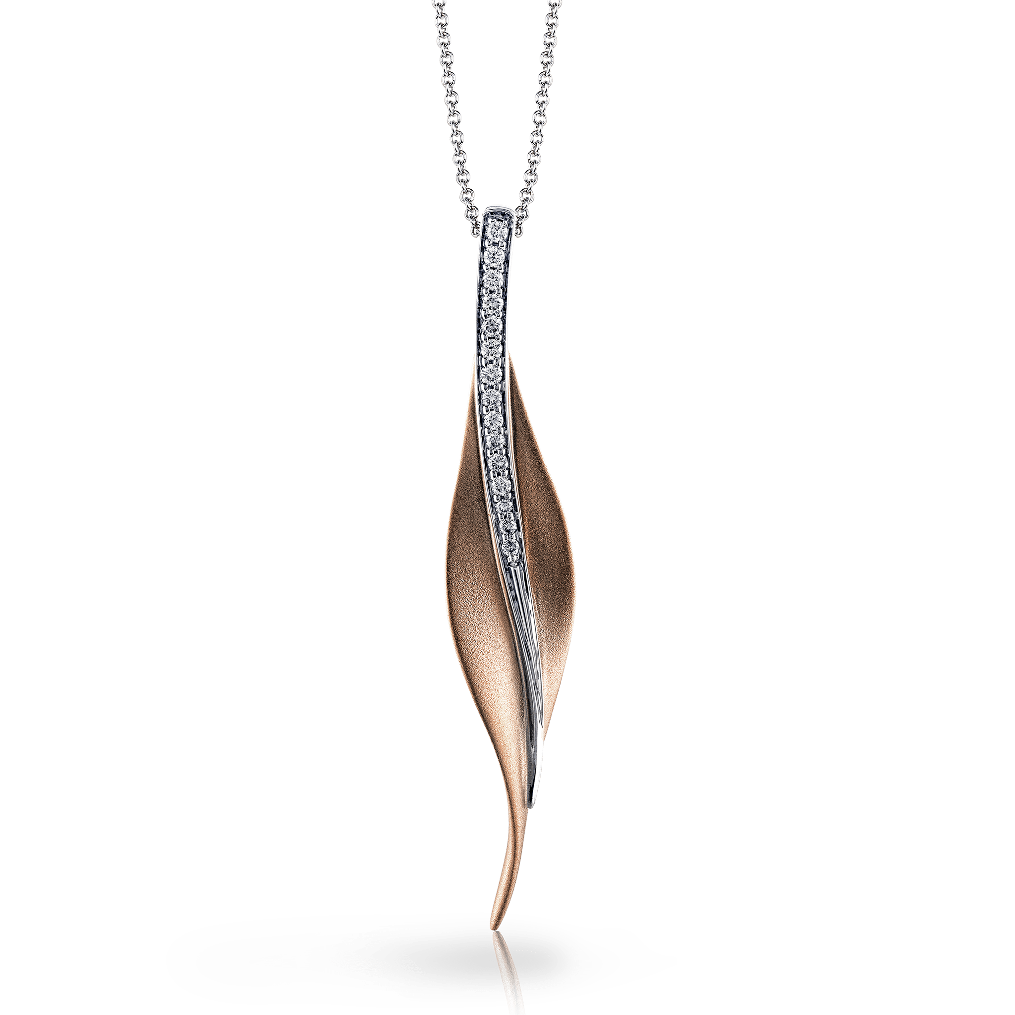 This modern, nature-inspired pendant features a sleek, svelte style highlighted by dazzling white diamonds.