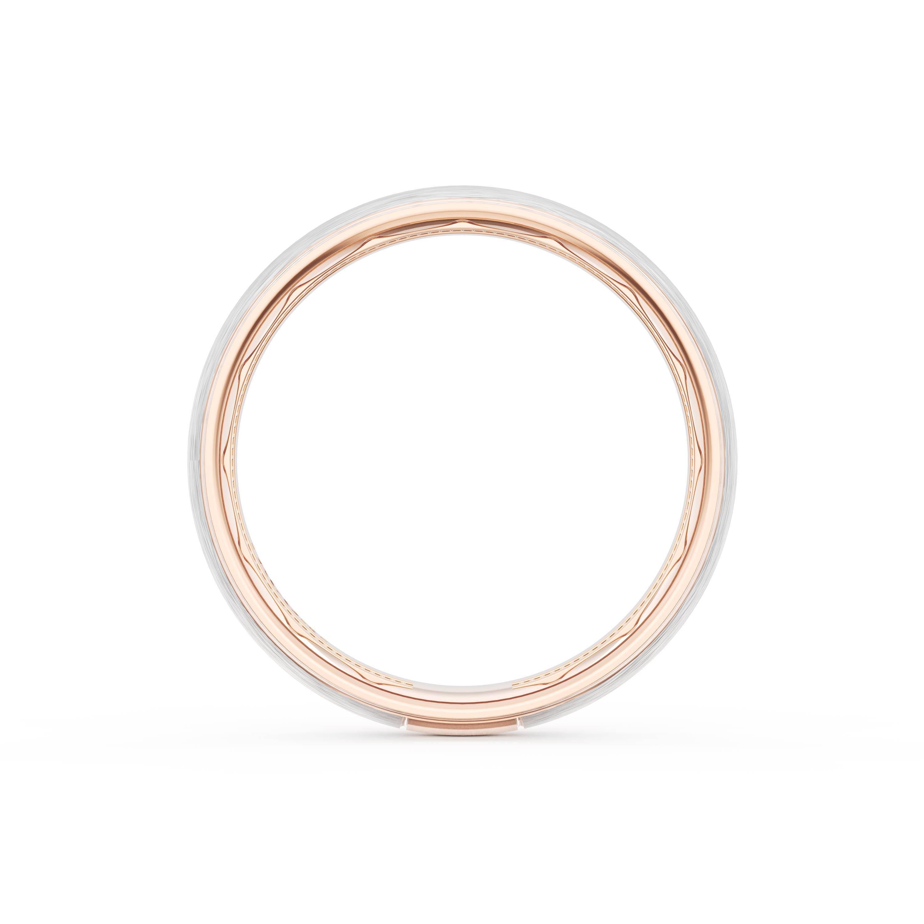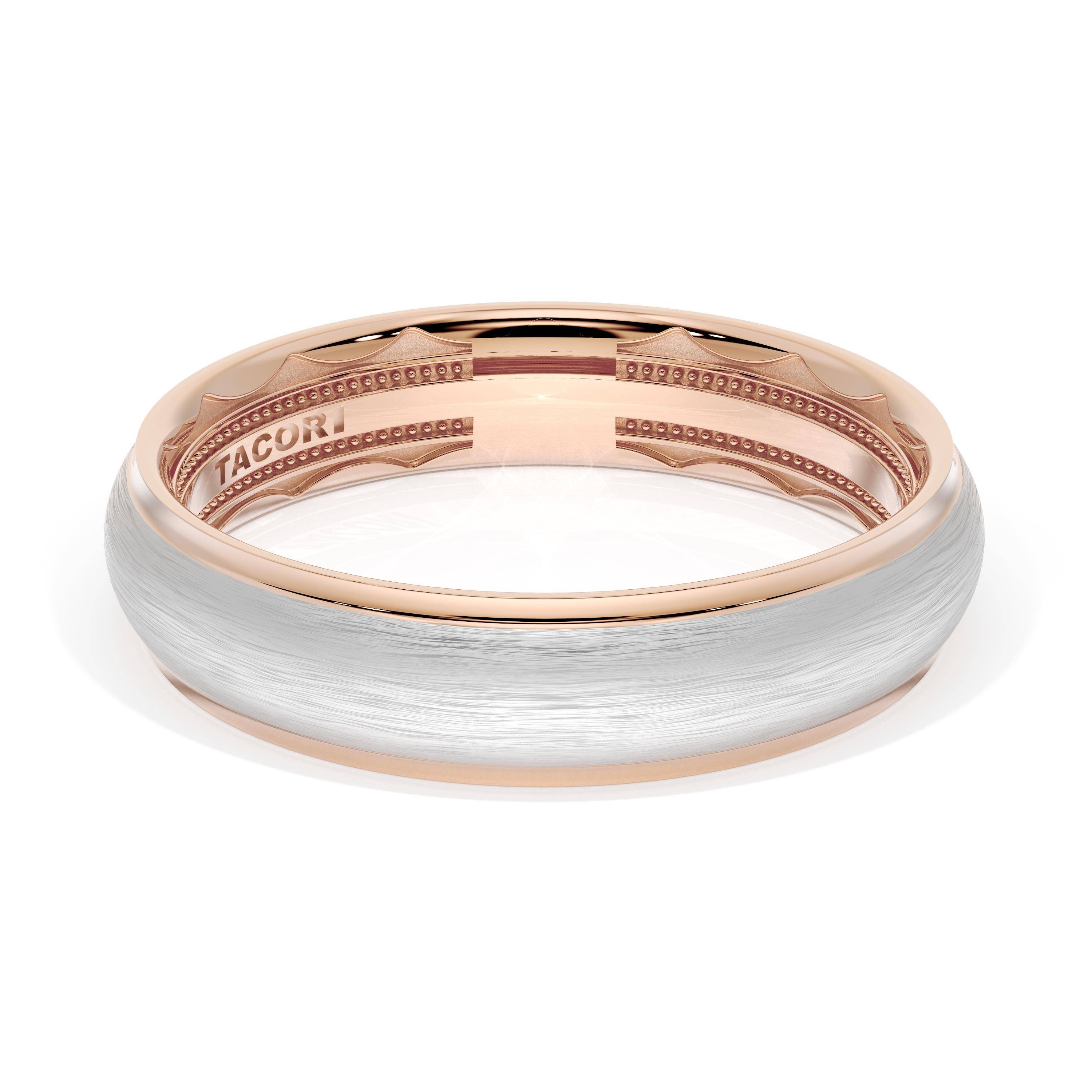 This two tone band of 18kt Rose Gold & Platinum features a gently rounded ceiling with a brush finish and milgrain detailing on the inner face.