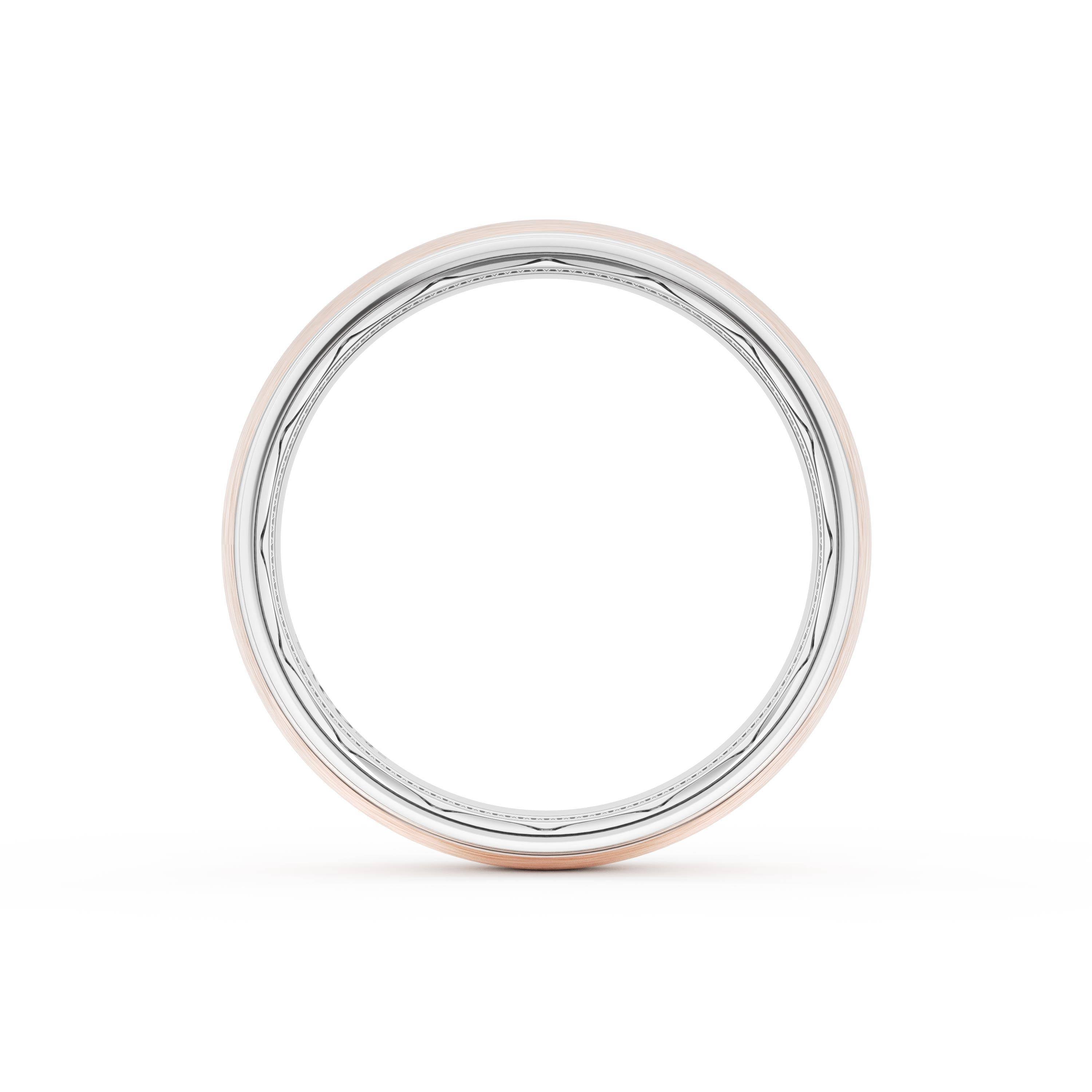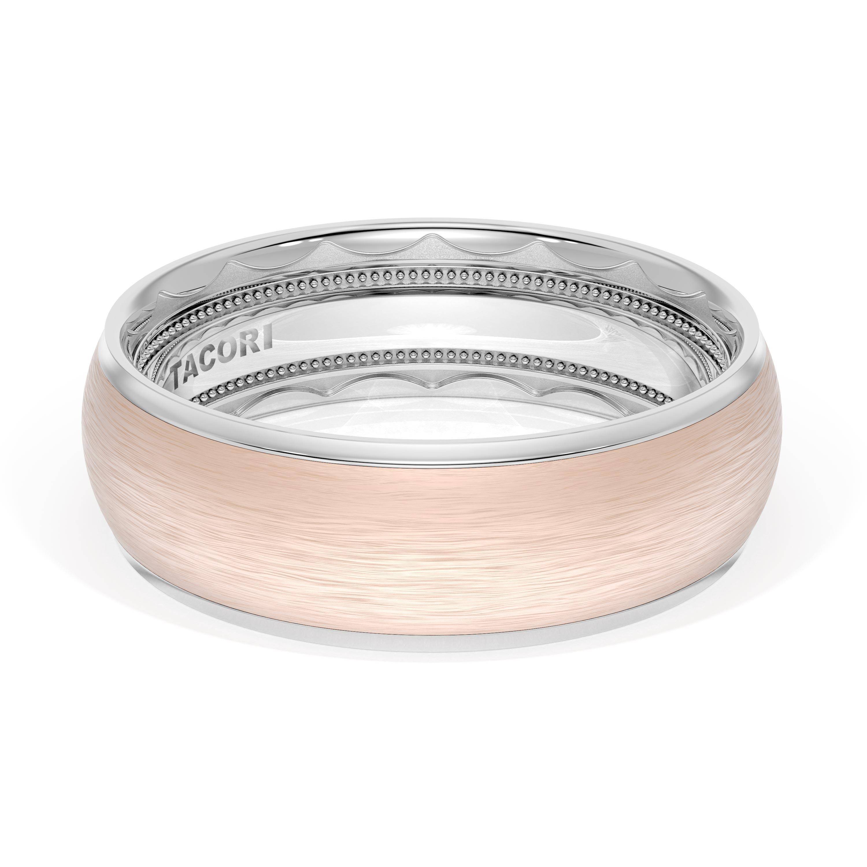This two tone band of 18kt White Gold & 18kt Rose Gold features a gently rounded ceiling with a brush finish and milgrain detailing on the inner face.