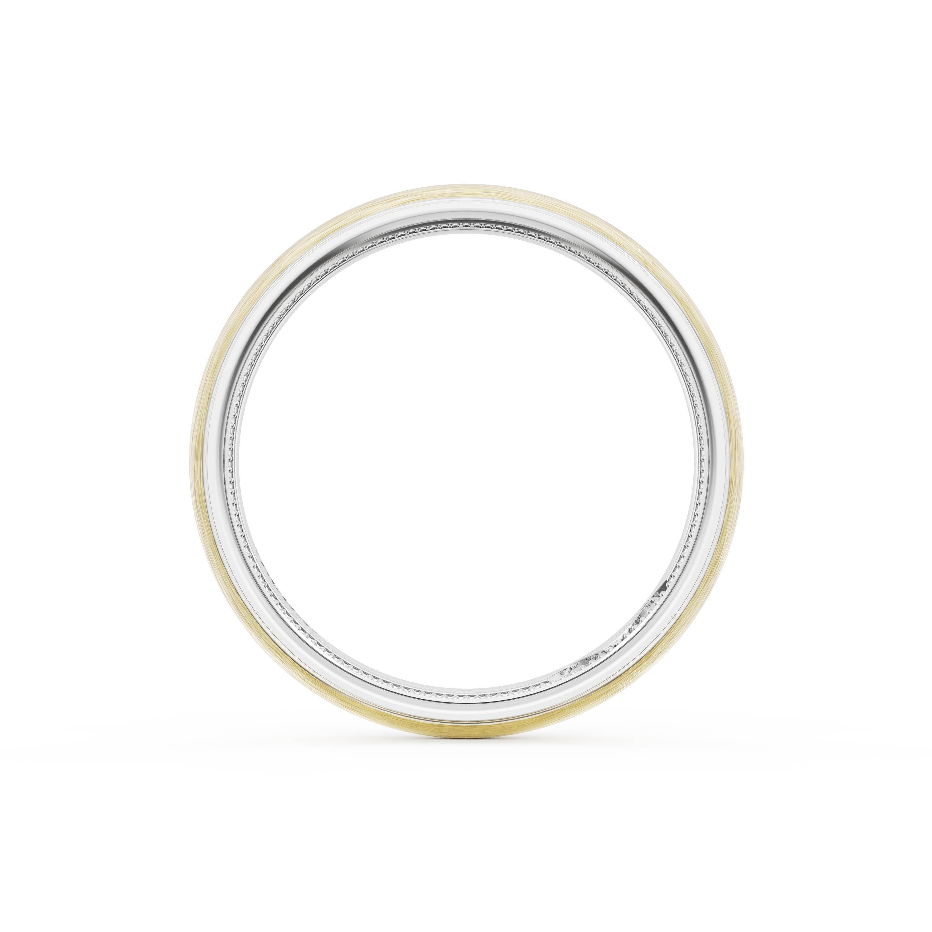 This two tone band of 18kt White Gold & 18kt Yellow Gold features a gently rounded ceiling with a brush finish and milgrain detailing on the inner face.