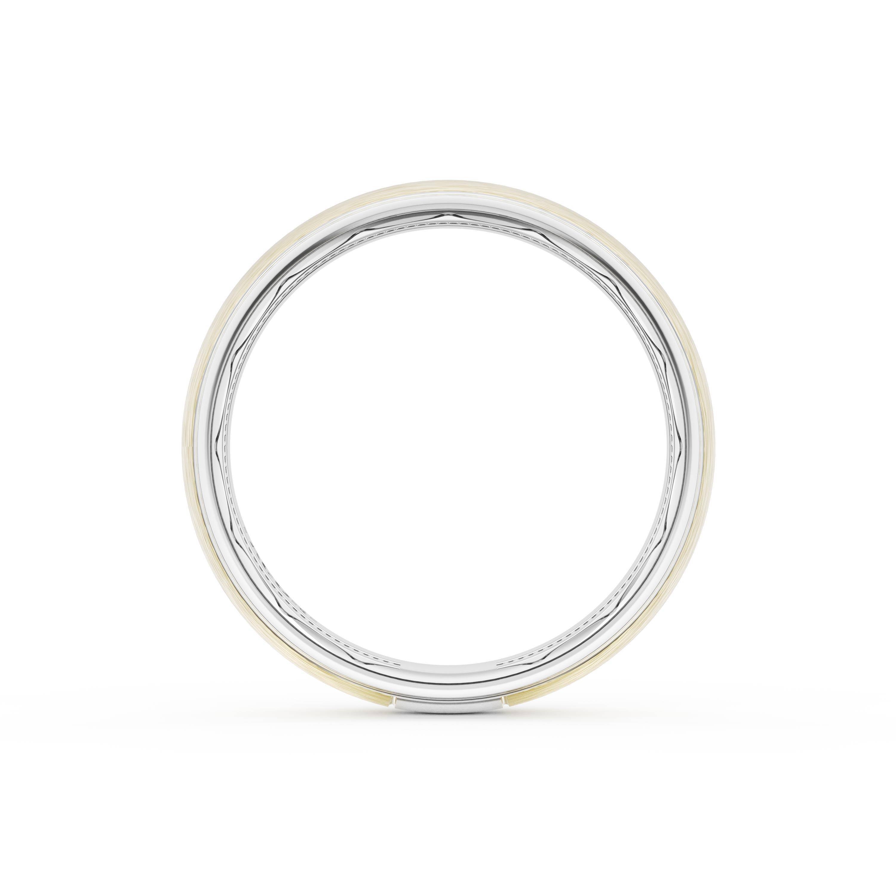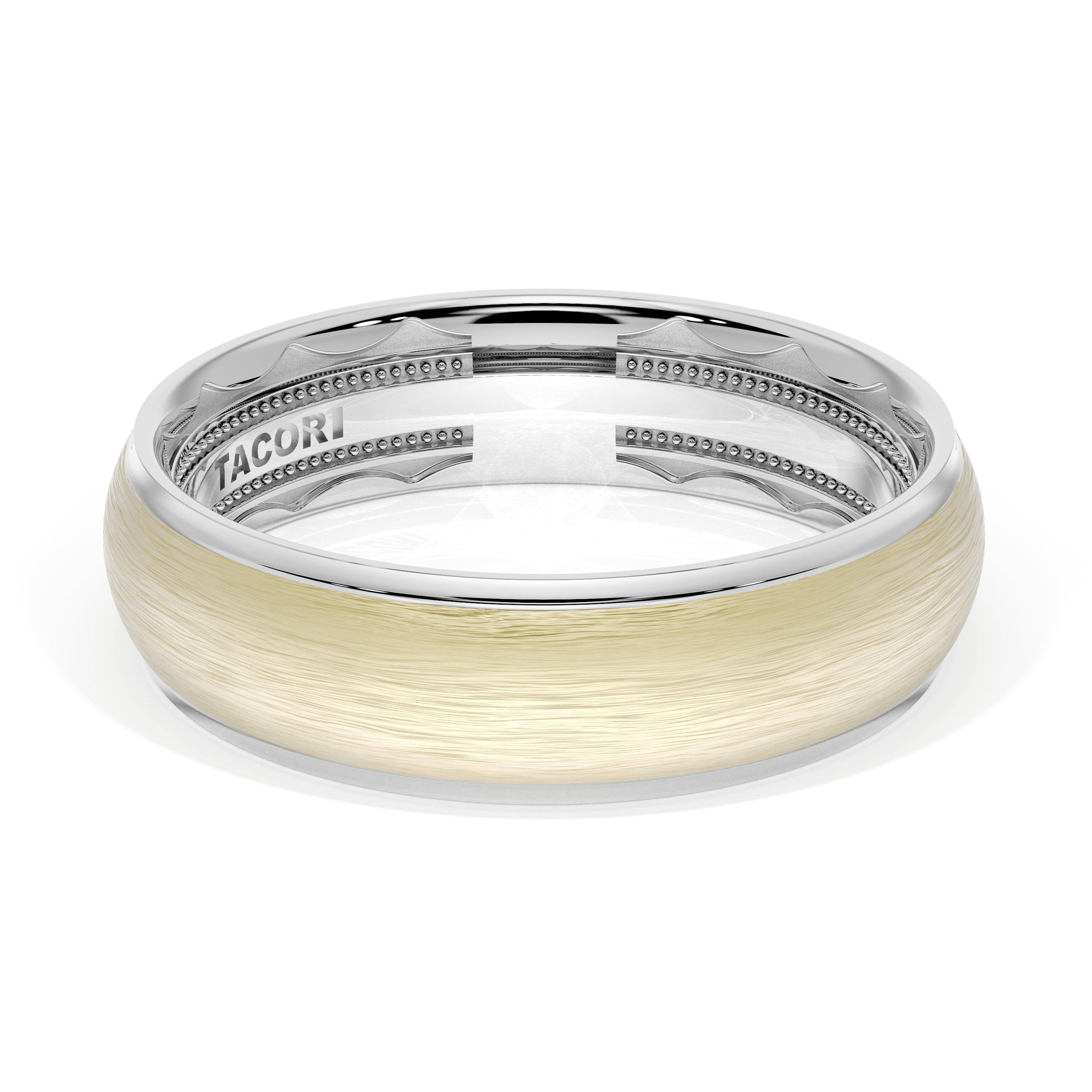 This two tone band of 18kt White Gold & 18kt Yellow Gold features a gently rounded ceiling with a brush finish and milgrain detailing on the inner face.