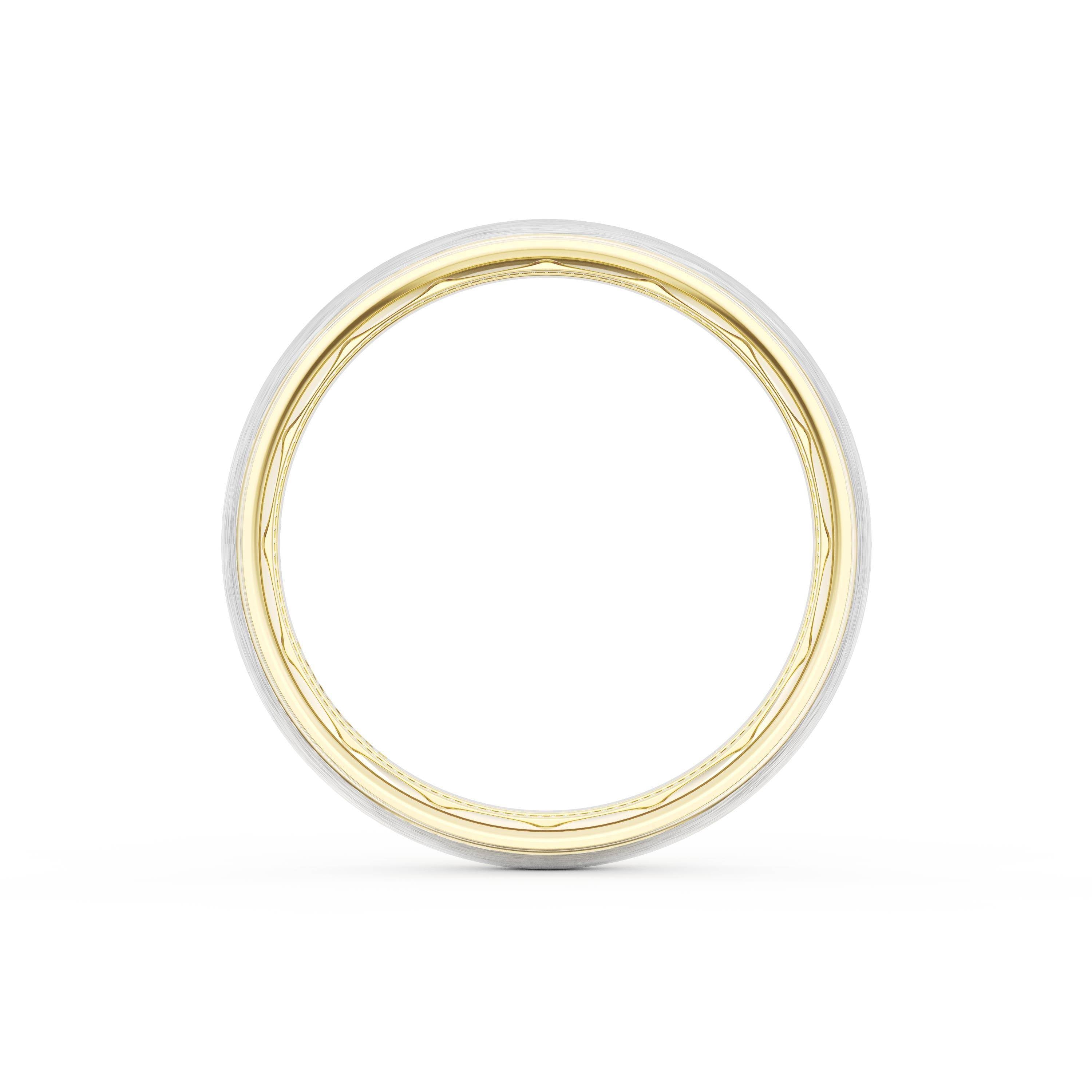This two tone band of 18kt Yellow Gold & 18kt White Gold features a gently rounded ceiling with a brush finish and milgrain detailing on the inner face.