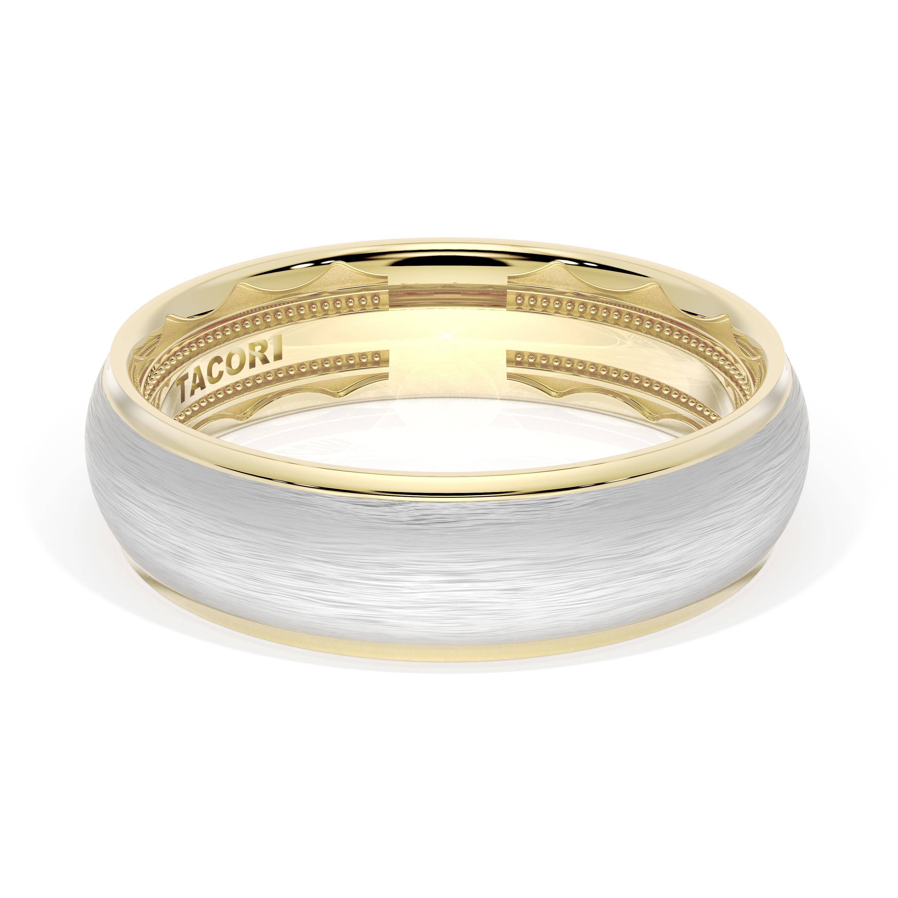 This two tone band of 18kt Yellow Gold & 18kt White Gold features a gently rounded ceiling with a brush finish and milgrain detailing on the inner face.