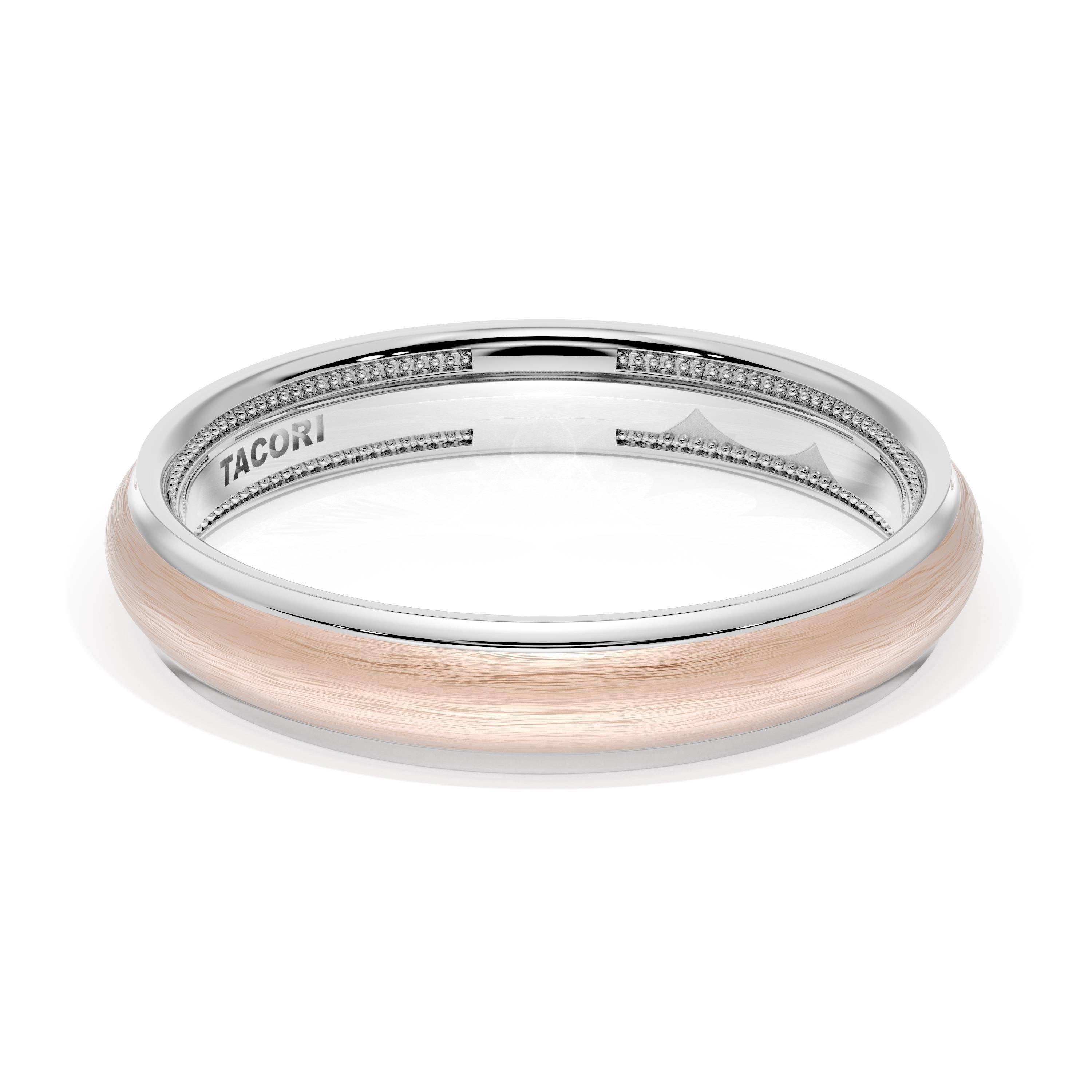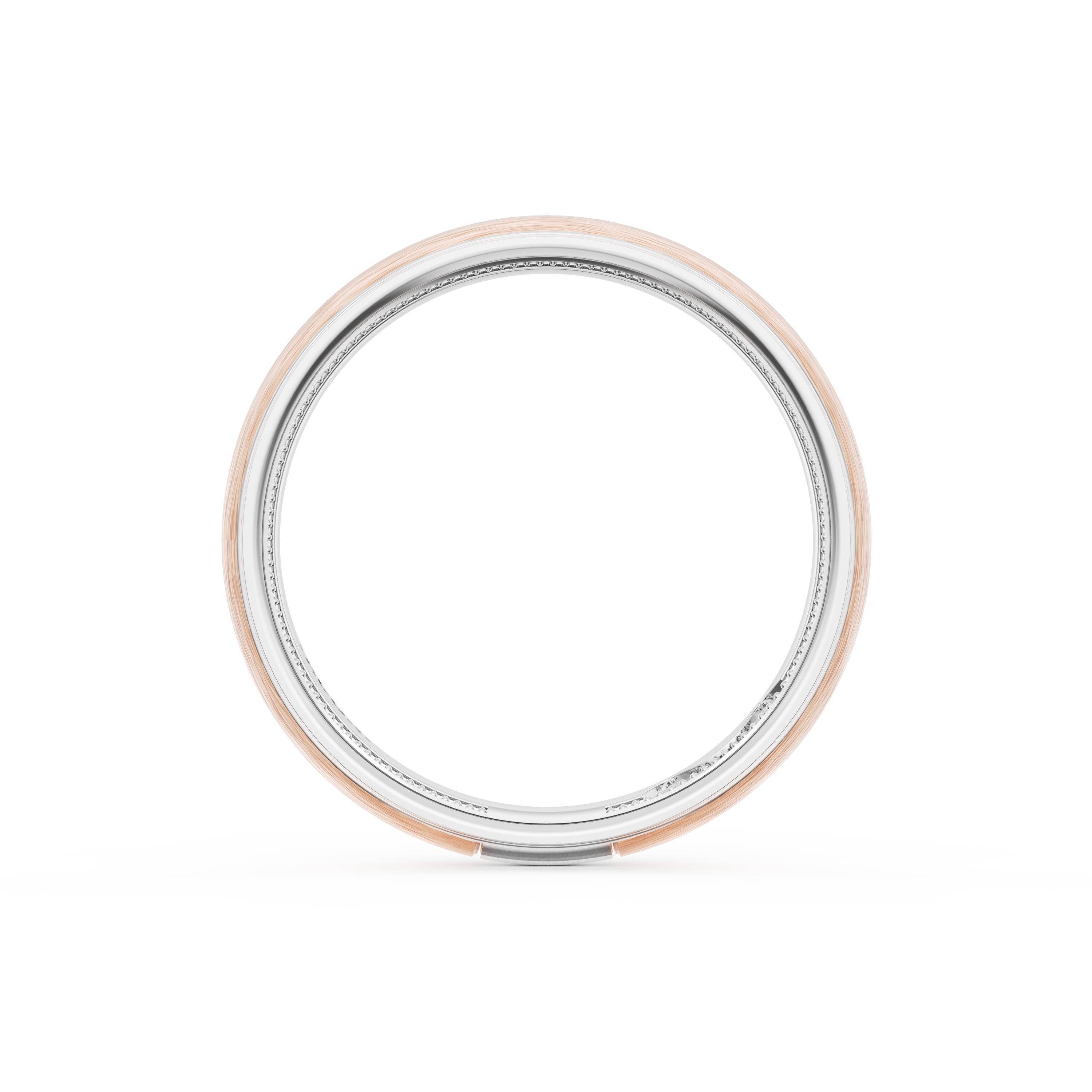 This two tone band of Platinum & 18kt Rose Gold features a gently rounded ceiling with a brush finish and milgrain detailing on the inner face.