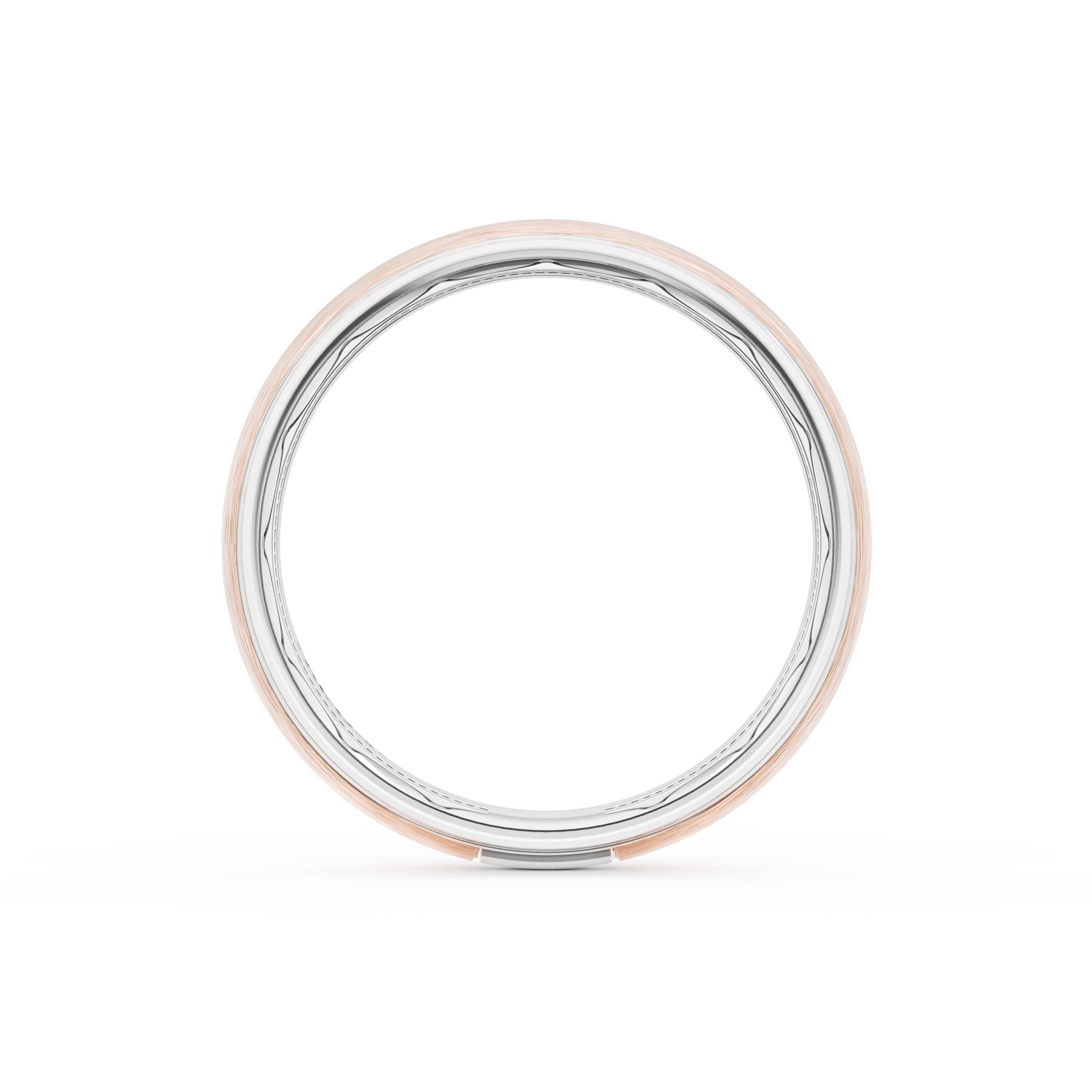 This two tone band of Platinum & 18kt Rose Gold features a gently rounded ceiling with a brush finish and milgrain detailing on the inner face.