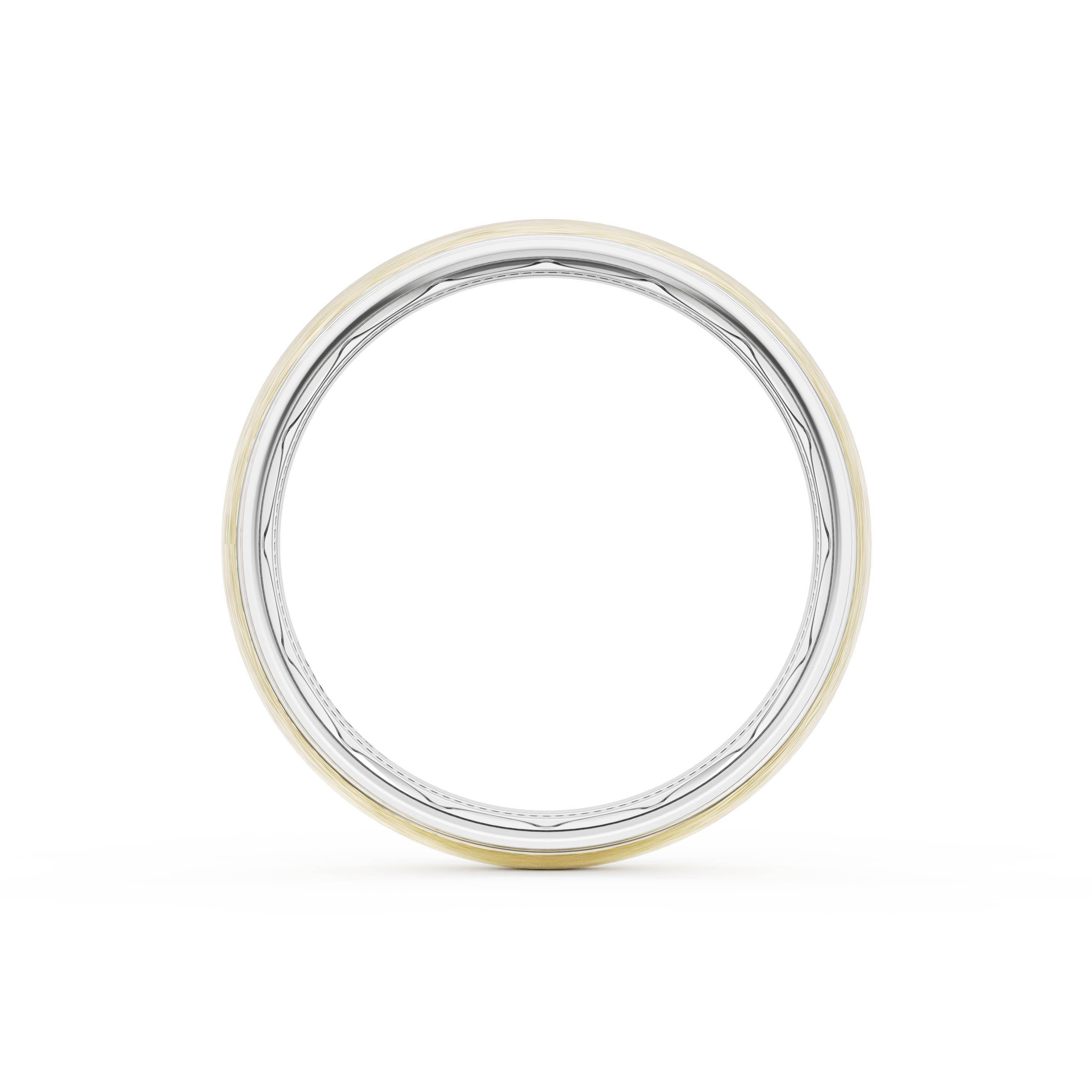 This two tone band of Platinum & 18kt Yellow Gold features a gently rounded ceiling with a brush finish and milgrain detailing on the inner face.