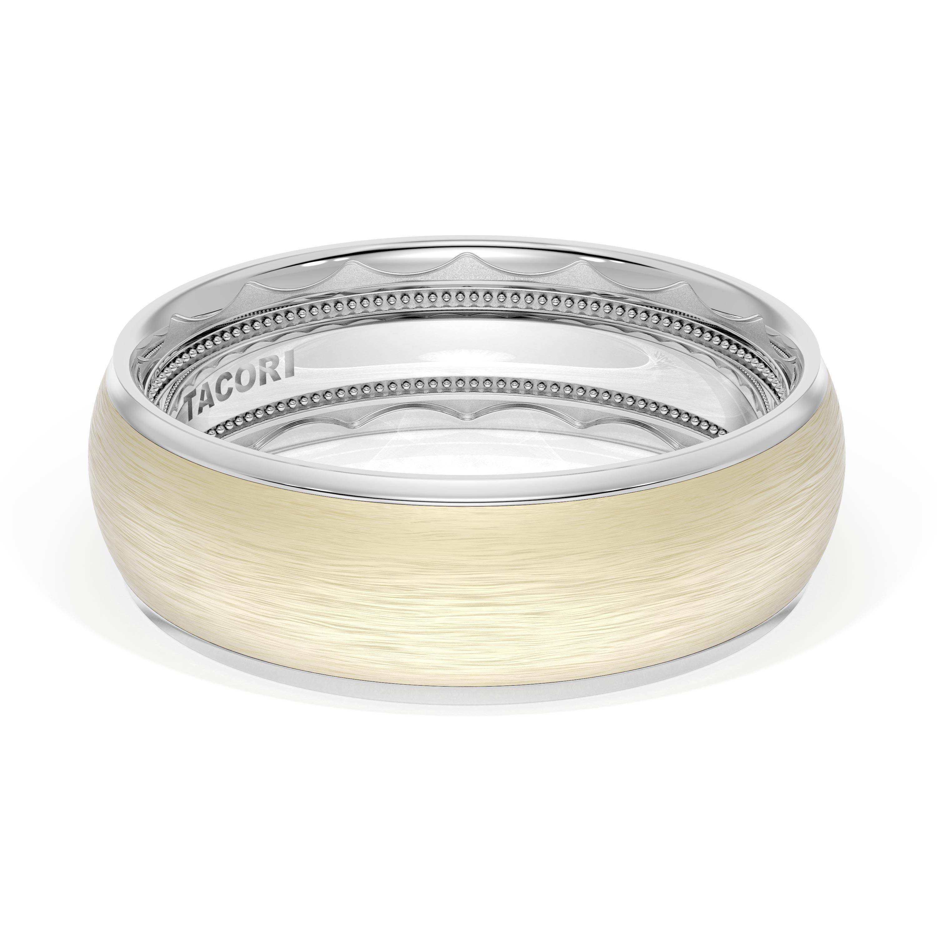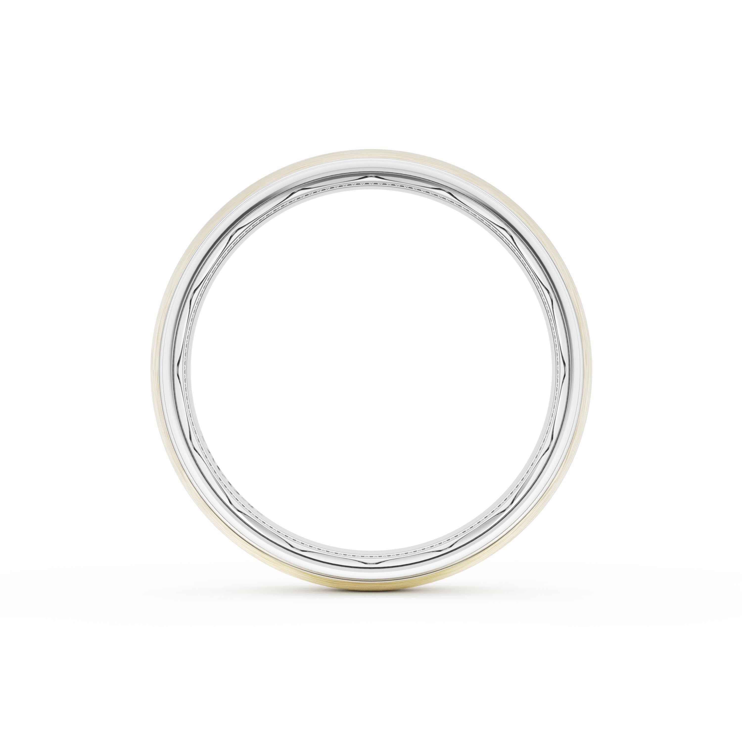 This two tone band of Platinum & 18kt Yellow Gold features a gently rounded ceiling with a brush finish and milgrain detailing on the inner face.