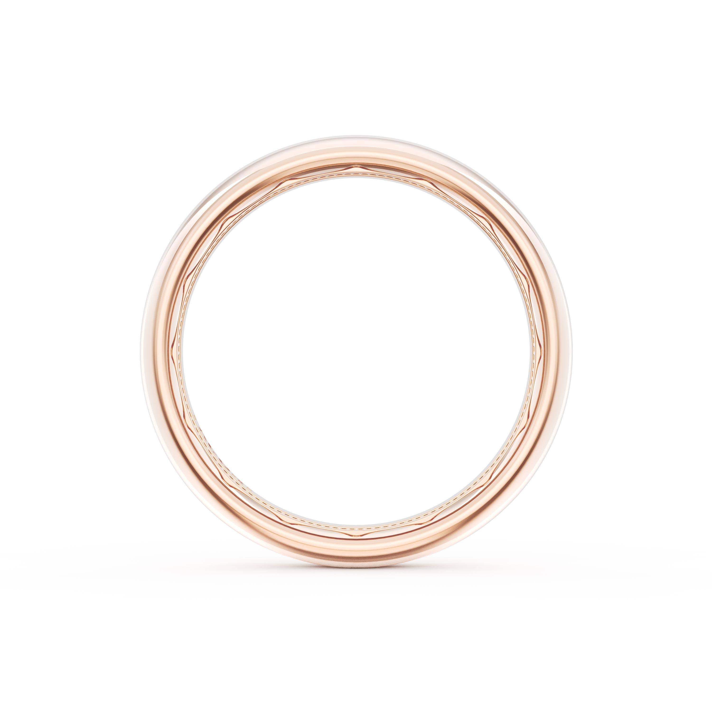 This gently rounded band of 18kt Rose Gold features a diamond and milgrain decorated ceiling with a high polish finish and milgrain detailing on the inner face.