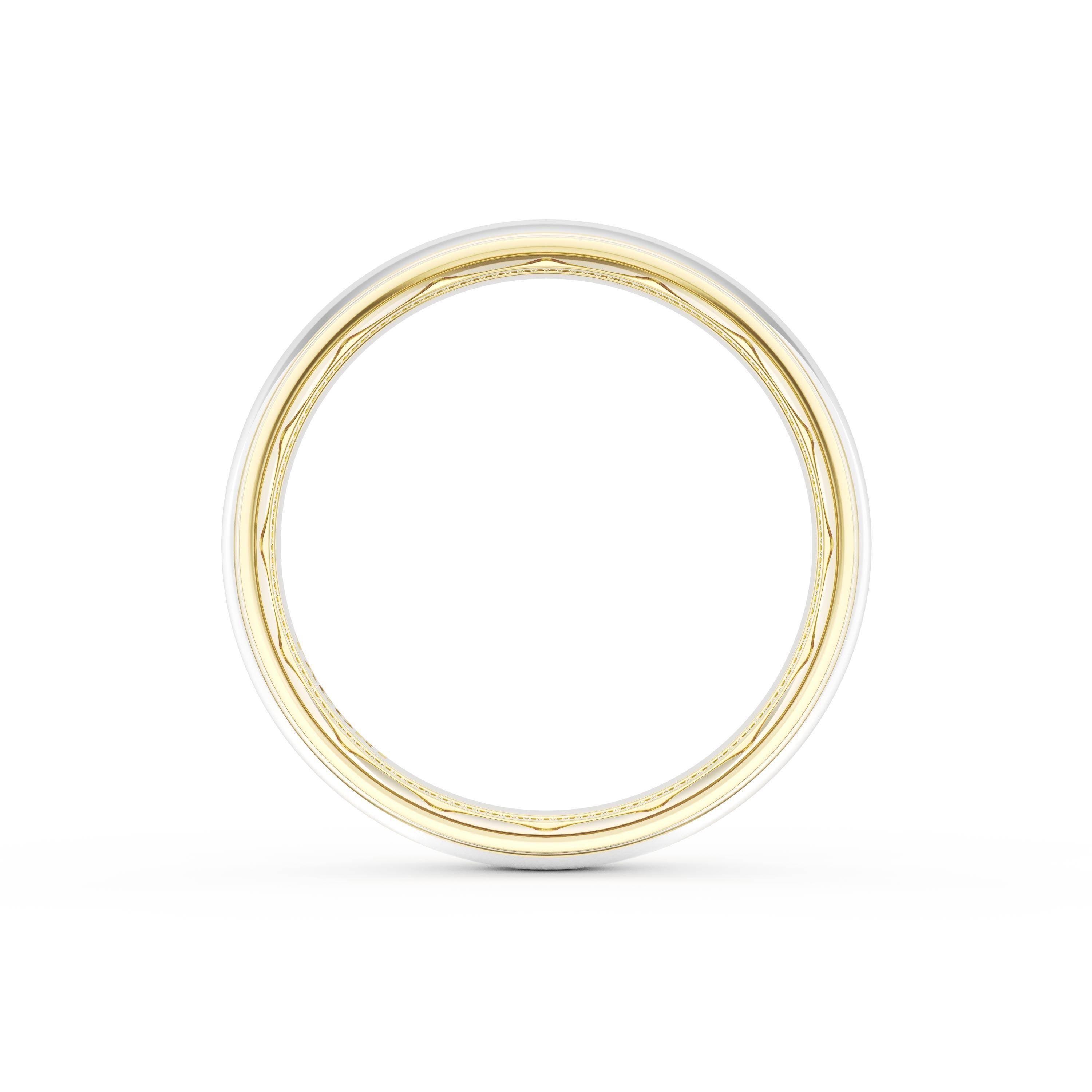 This two tone band of 18kt Yellow Gold & 18kt White Gold features a gently rounded ceiling with a high polish finish and milgrain detailing on the inner face.