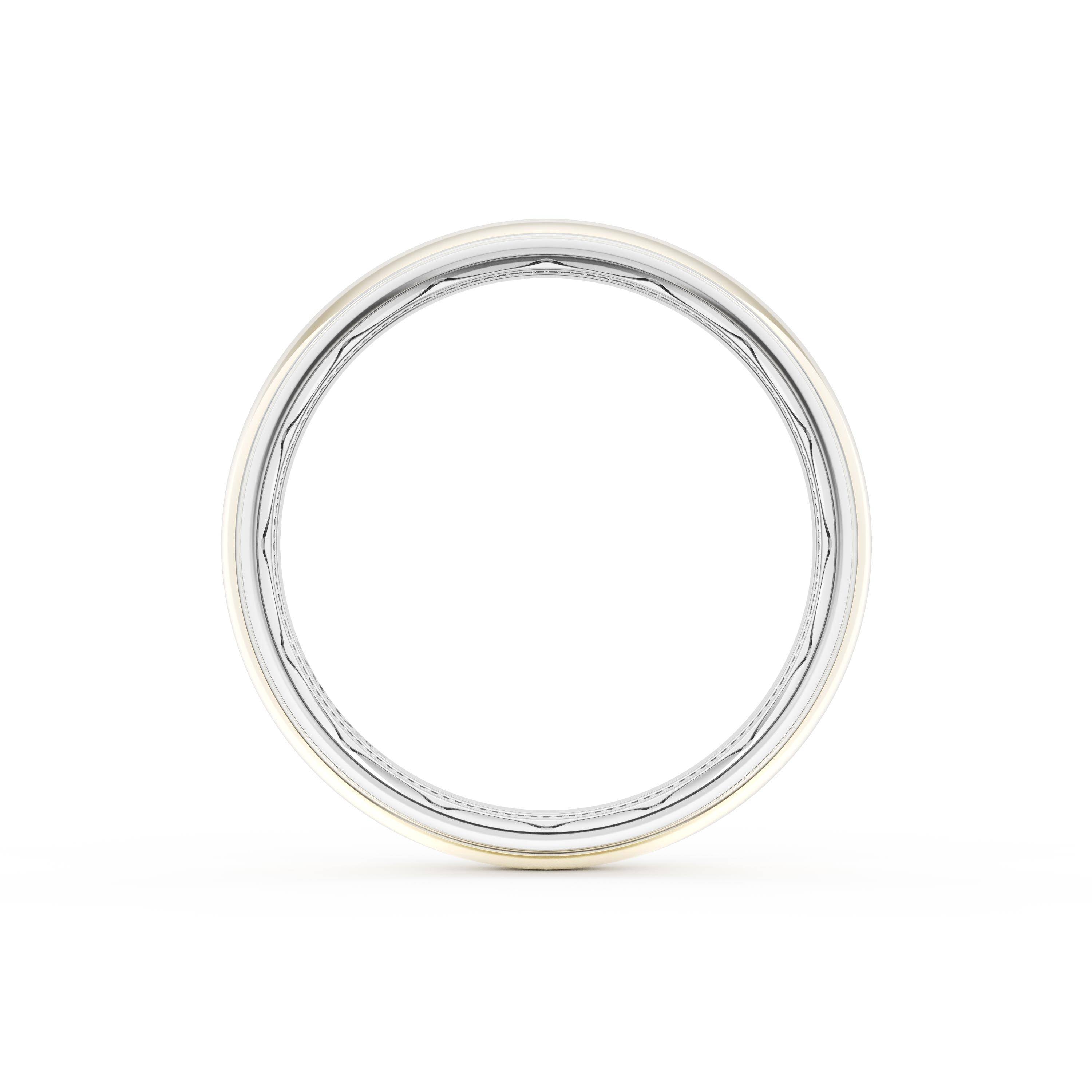 This two tone band of Platinum & 18kt Yellow Gold features a gently rounded ceiling with a high polish finish and milgrain detailing on the inner face.