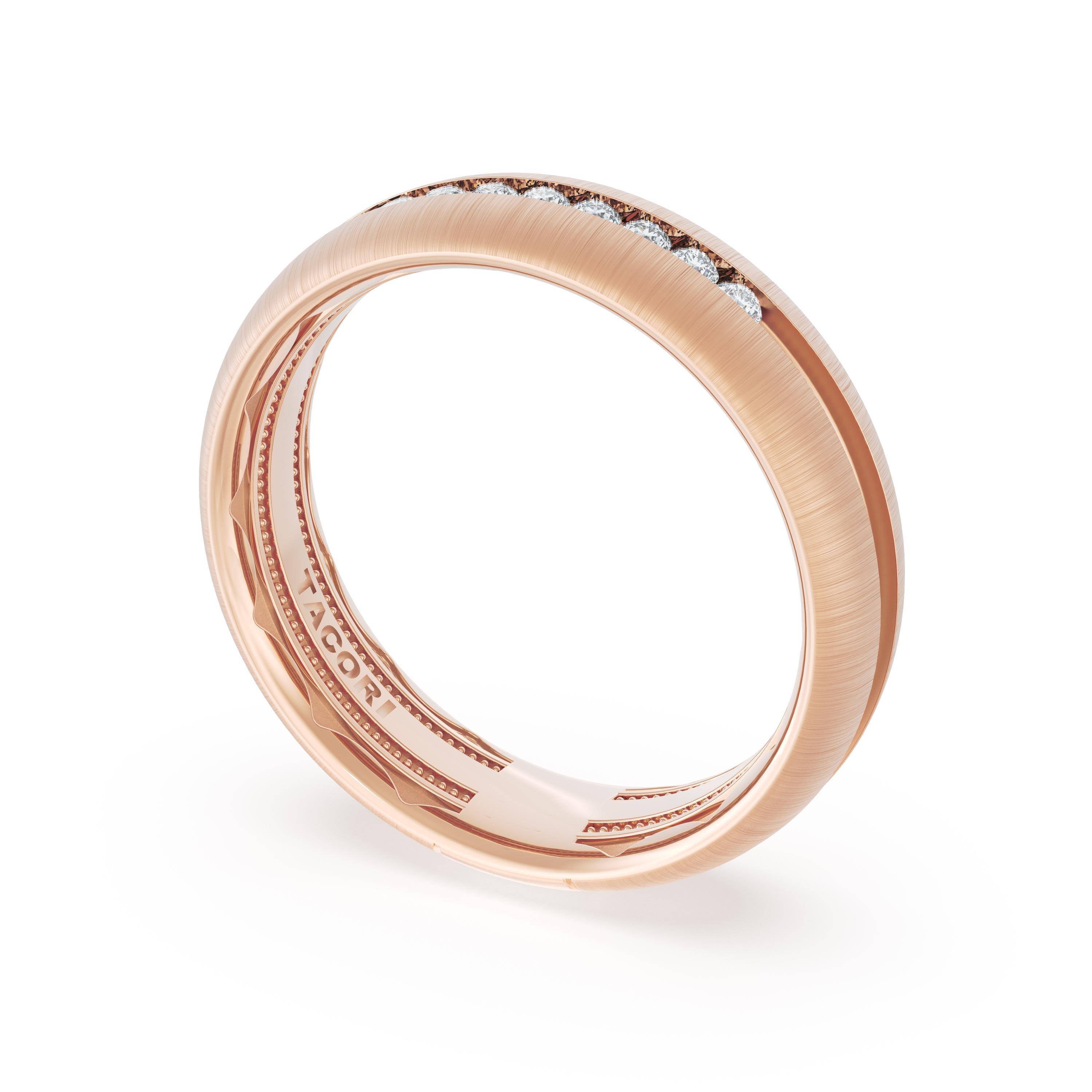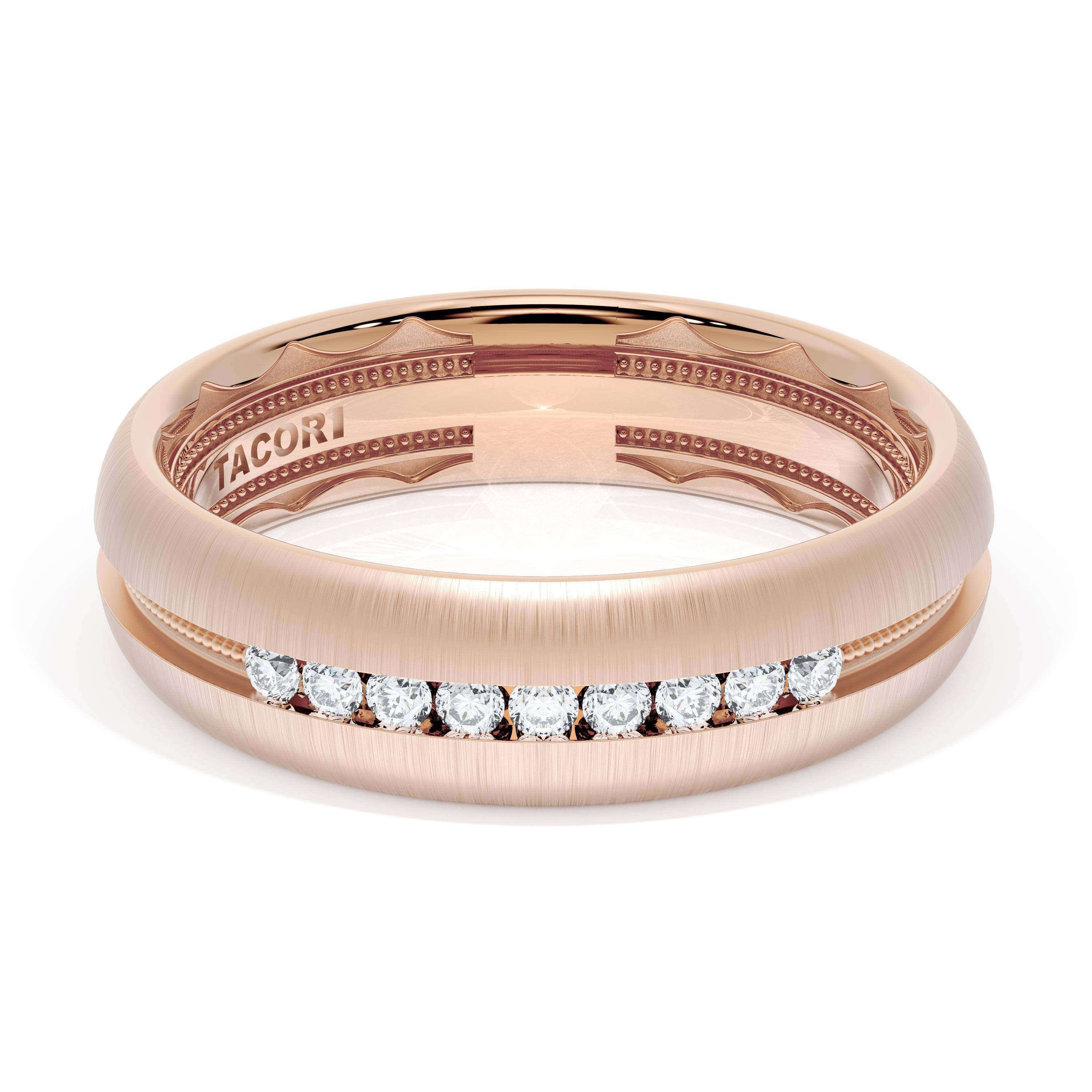 This gently rounded band of 18kt Rose Gold features a diamond and milgrain decorated ceiling with a satin finish and milgrain detailing on the inner face.