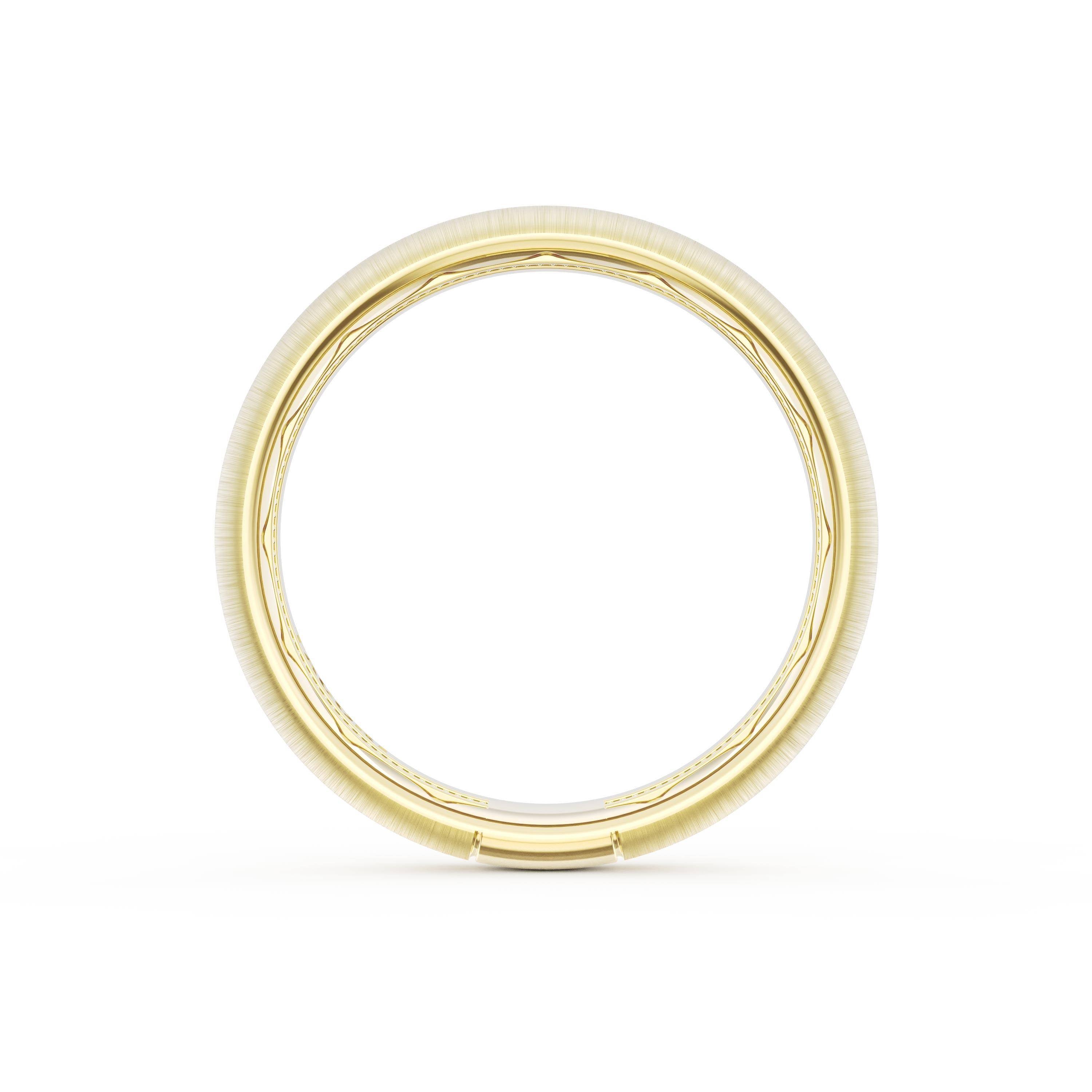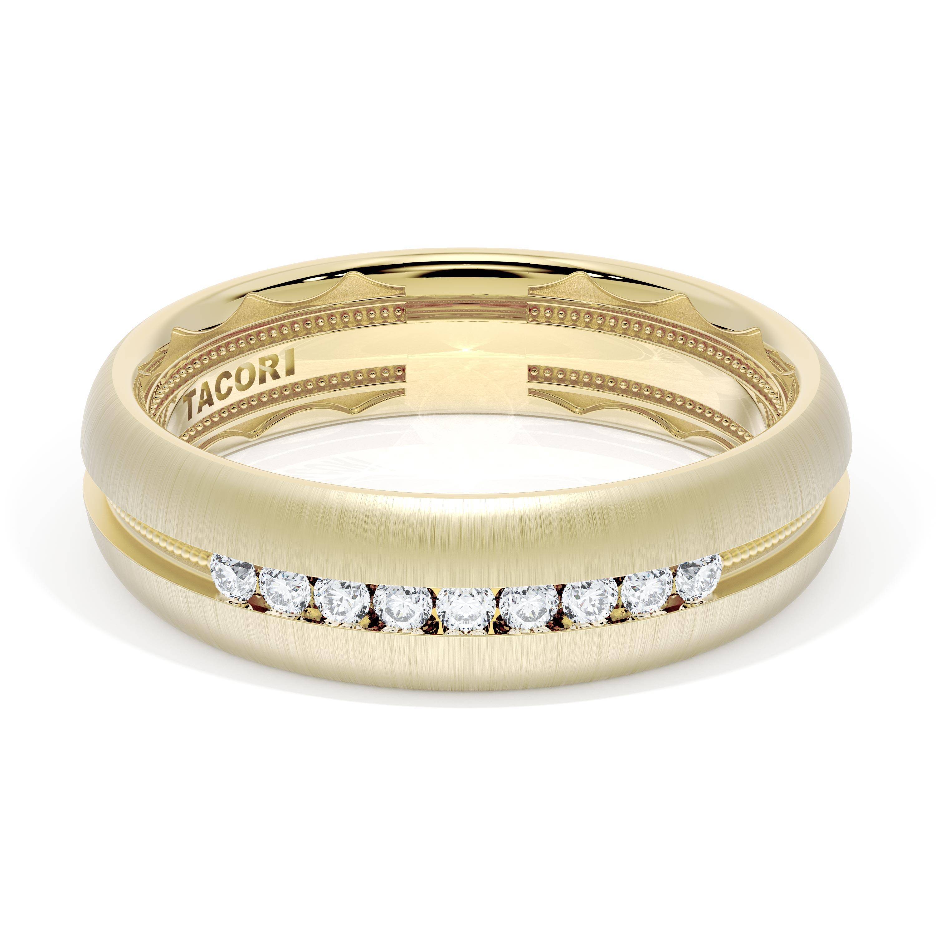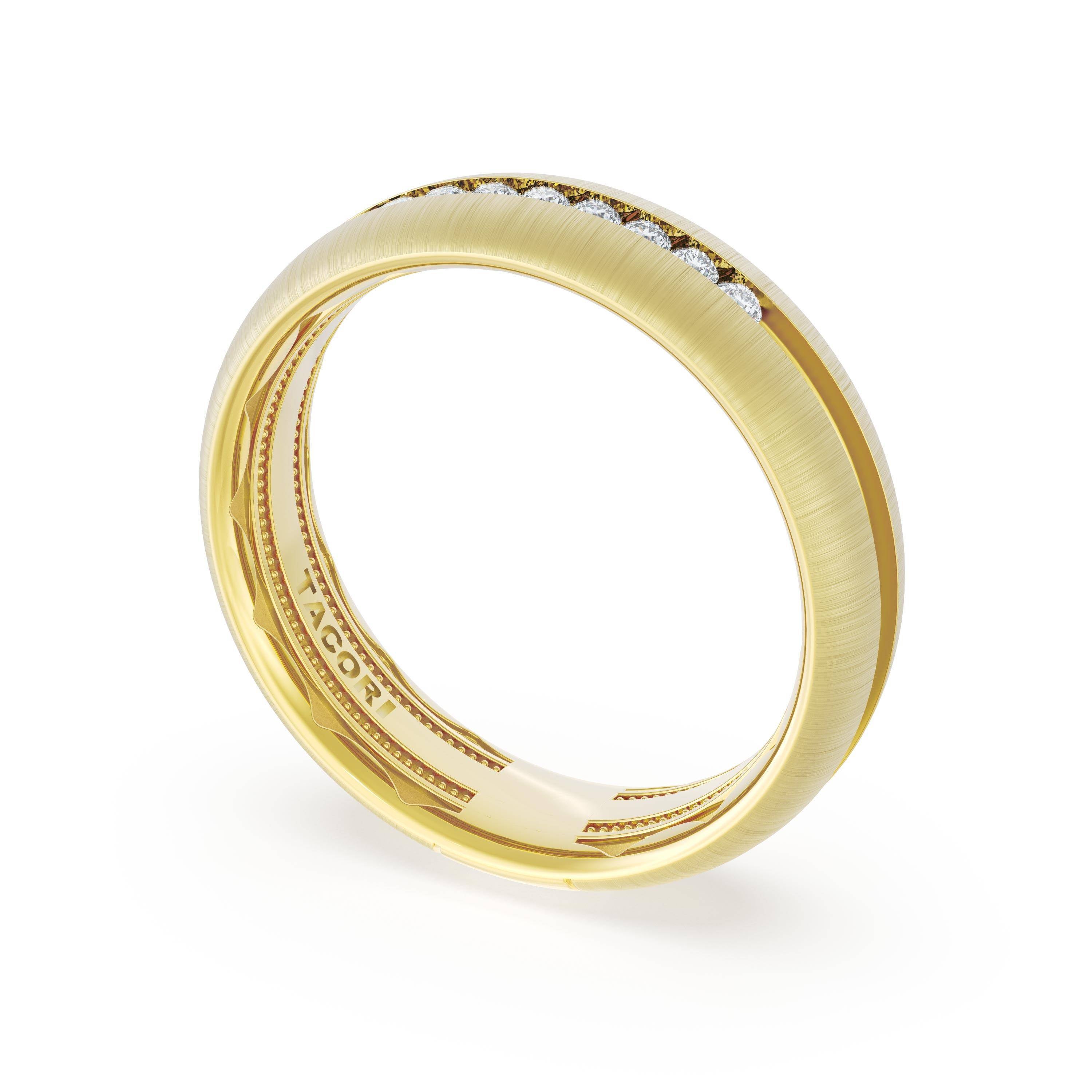 This gently rounded band of 18kt Yellow Gold features a diamond and milgrain decorated ceiling with a satin finish and milgrain detailing on the inner face.