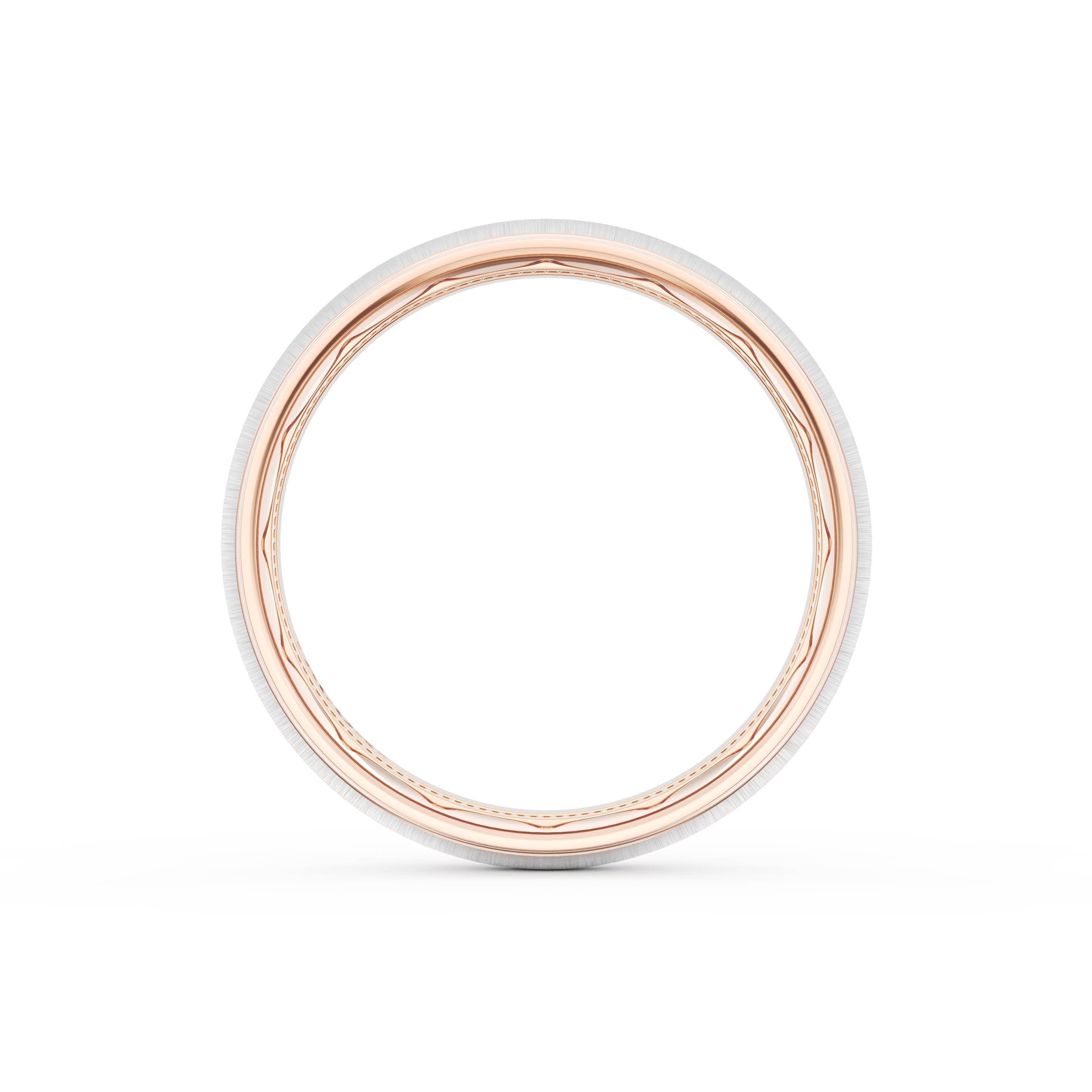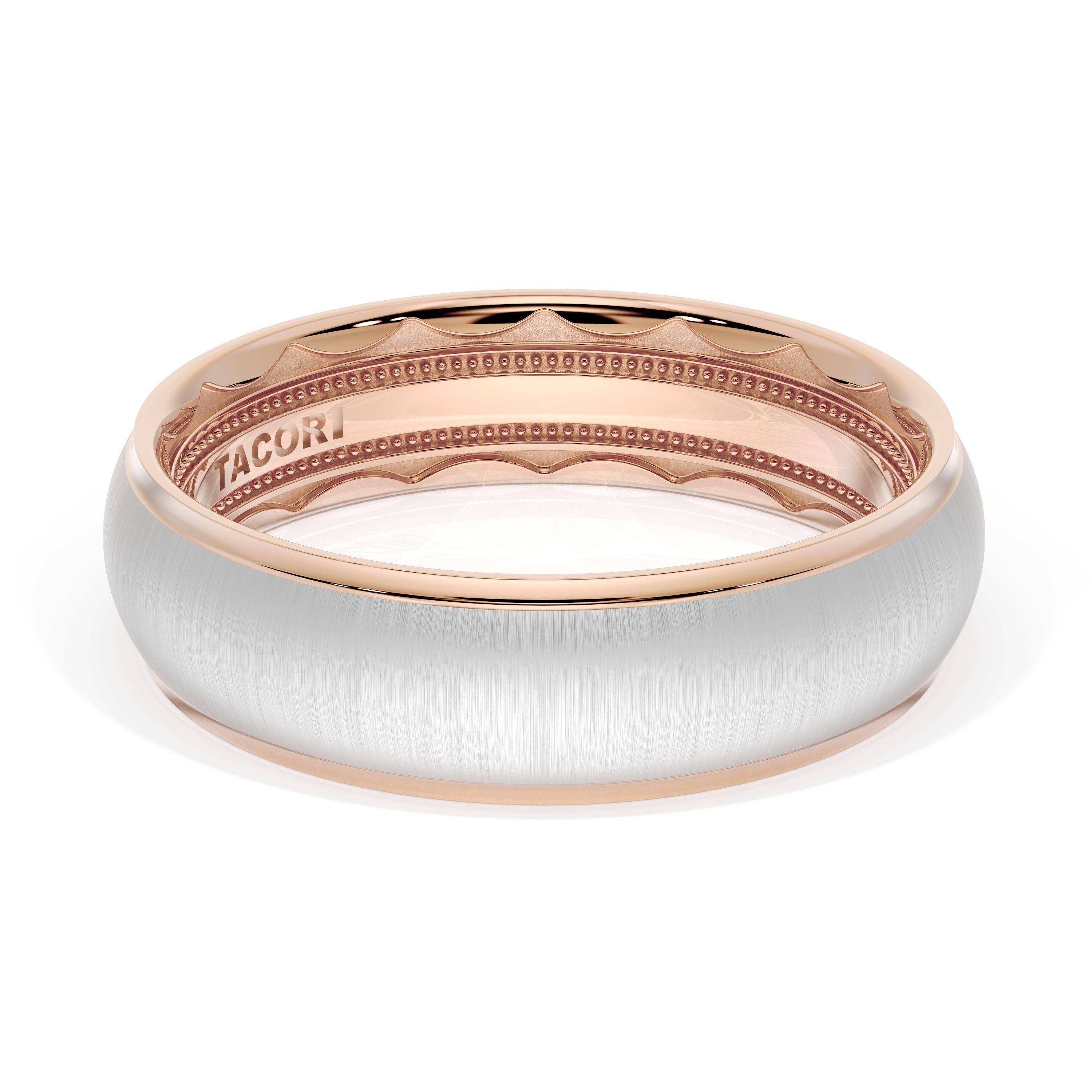 This two tone band of 18kt Rose Gold & 18kt White Gold features a gently rounded ceiling with a satin finish and milgrain detailing on the inner face.