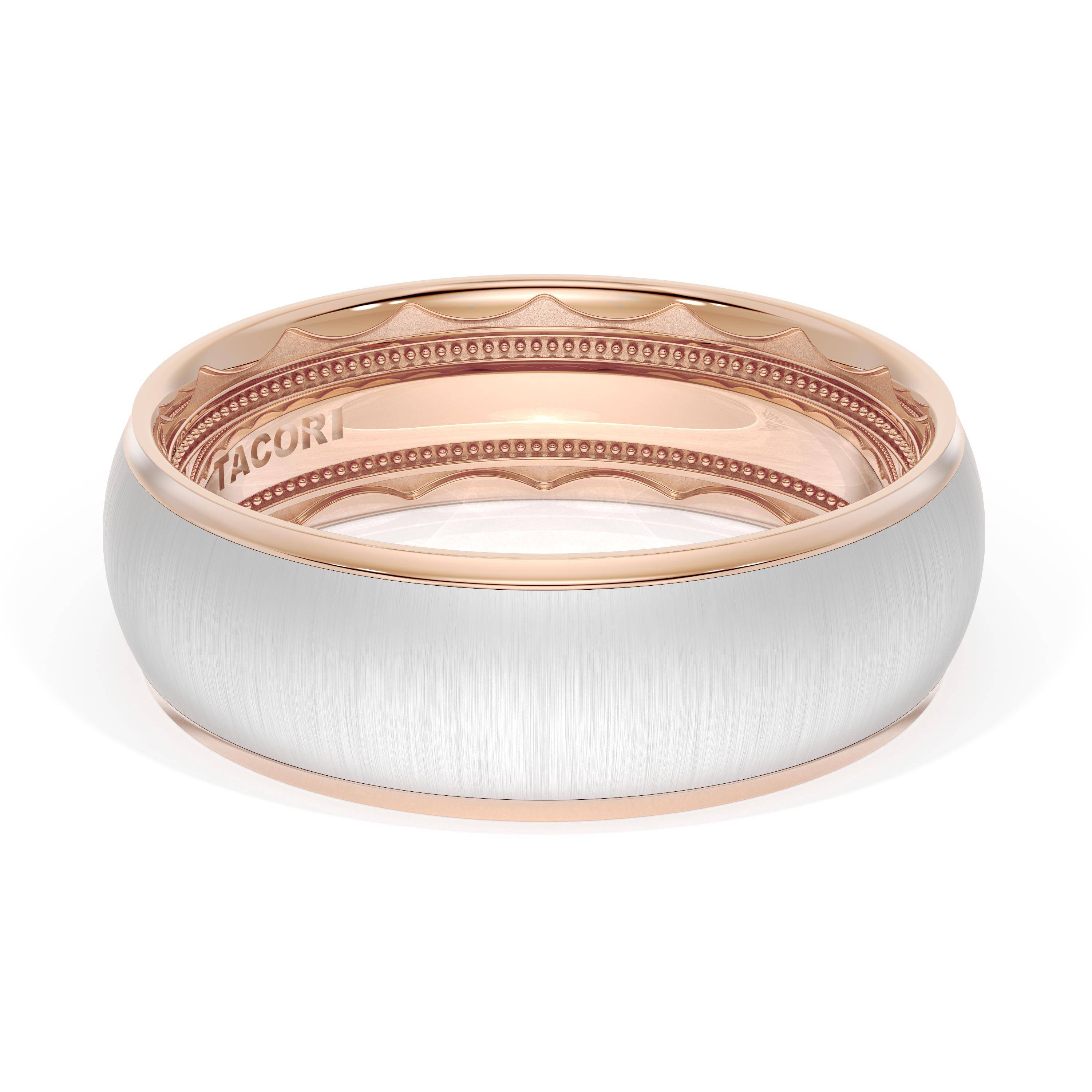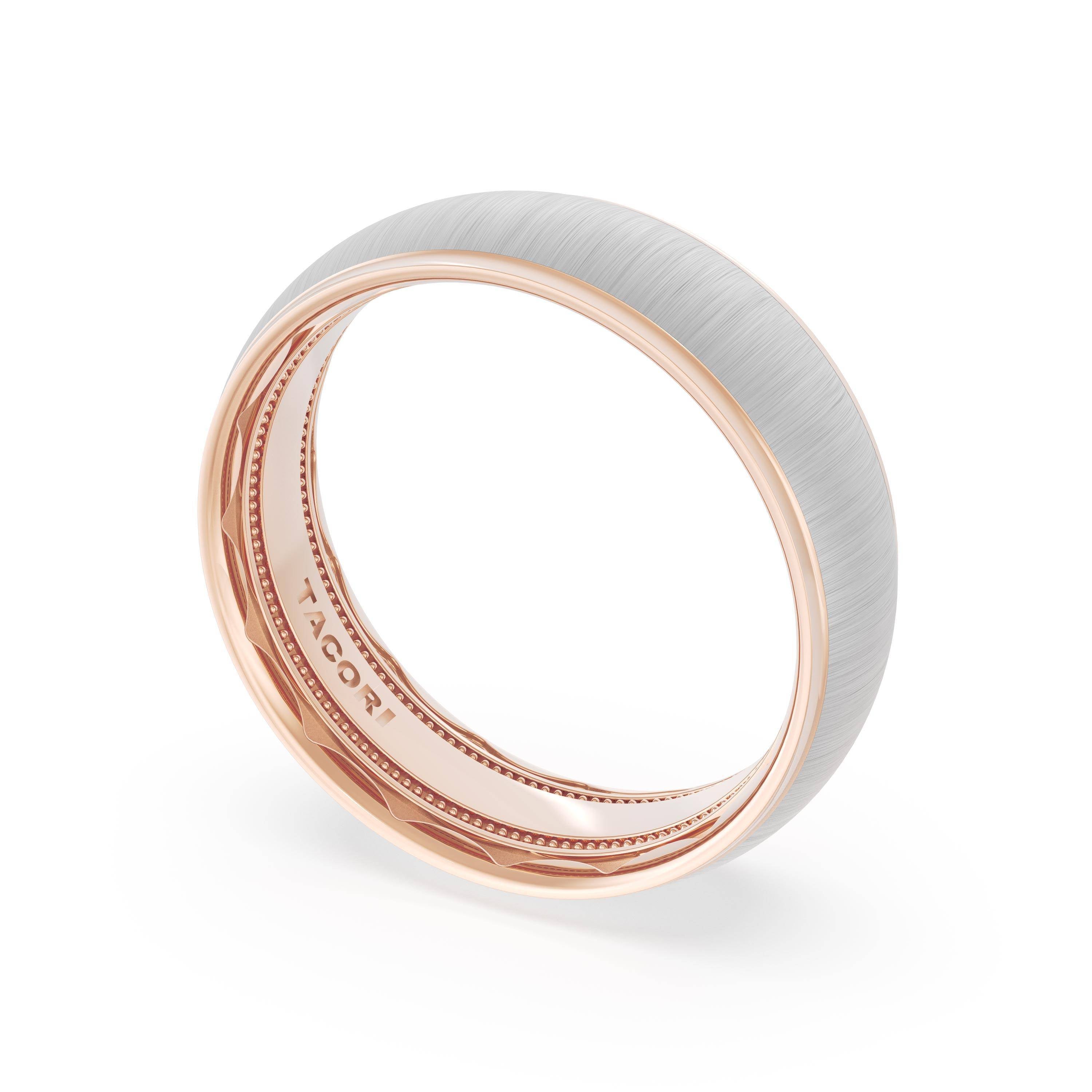 This two tone band of 18kt Rose Gold & 18kt White Gold features a gently rounded ceiling with a satin finish and milgrain detailing on the inner face.