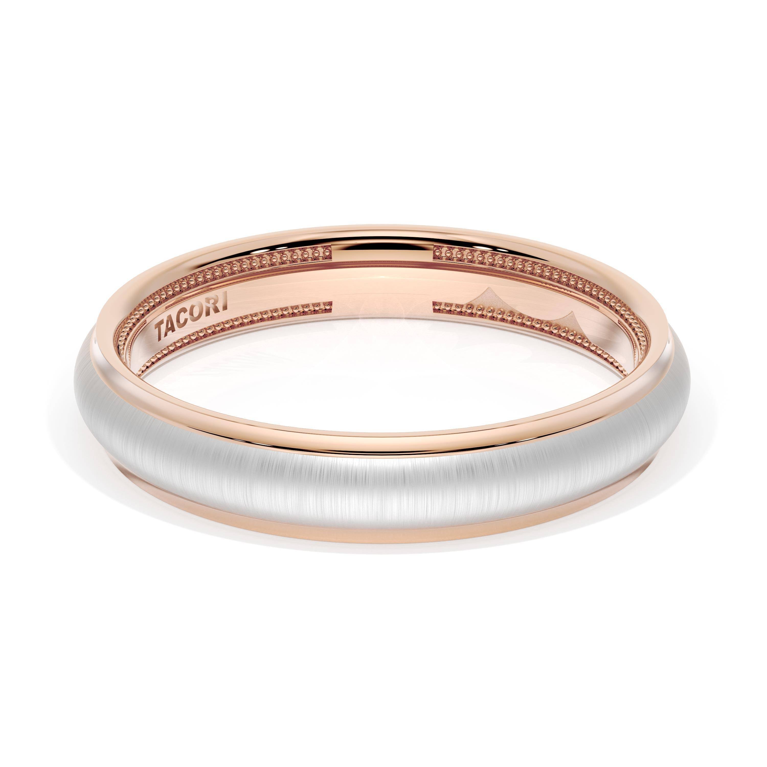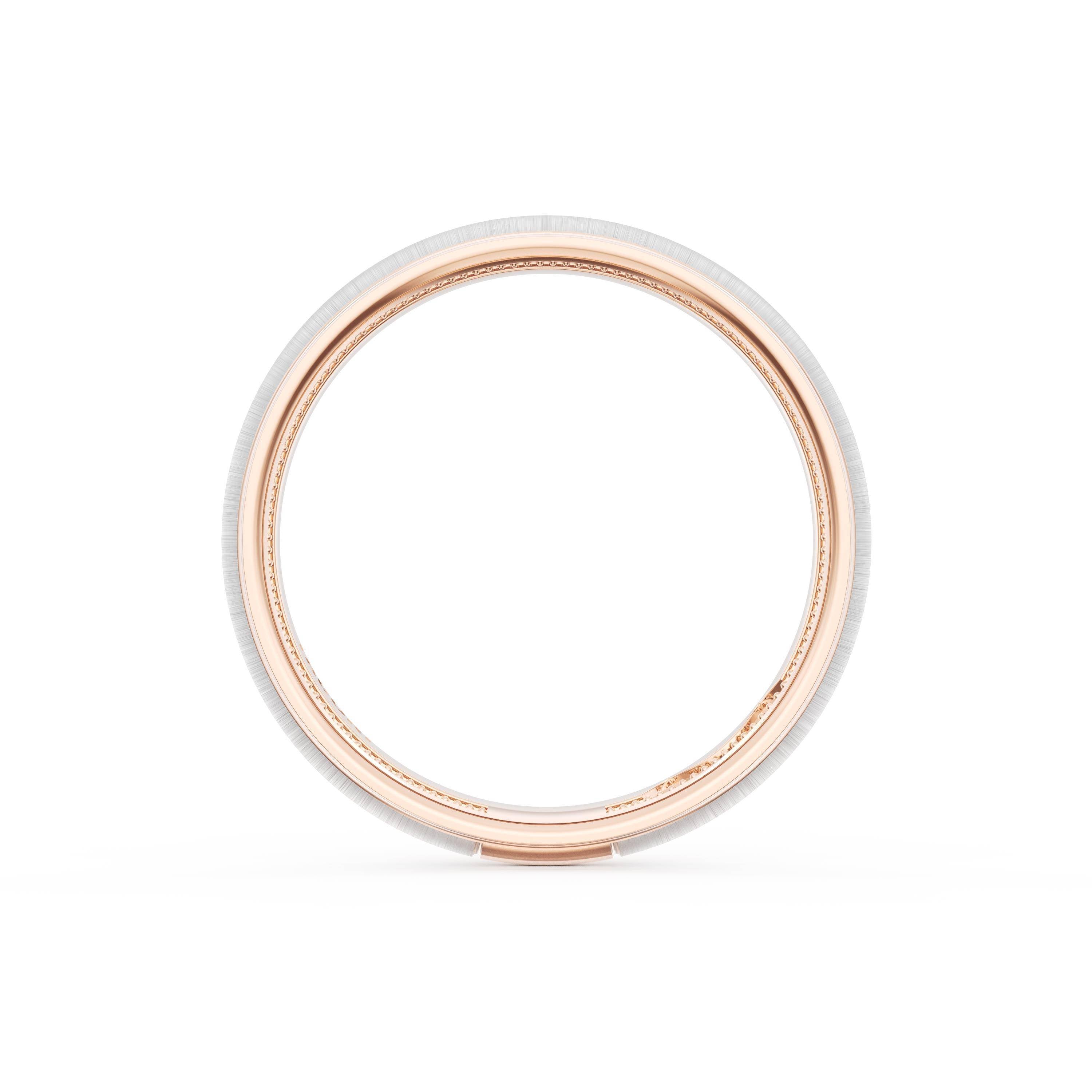 This two tone band of 18kt Rose Gold & Platinum features a gently rounded ceiling with a satin finish and milgrain detailing on the inner face.
