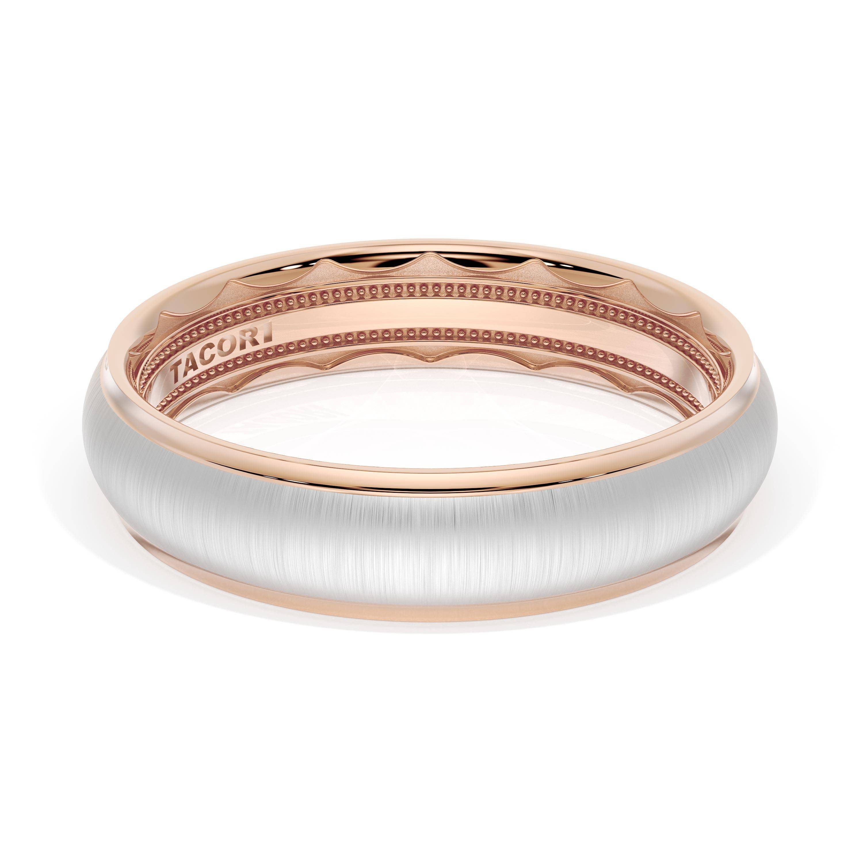 This two tone band of 18kt Rose Gold & Platinum features a gently rounded ceiling with a satin finish and milgrain detailing on the inner face.