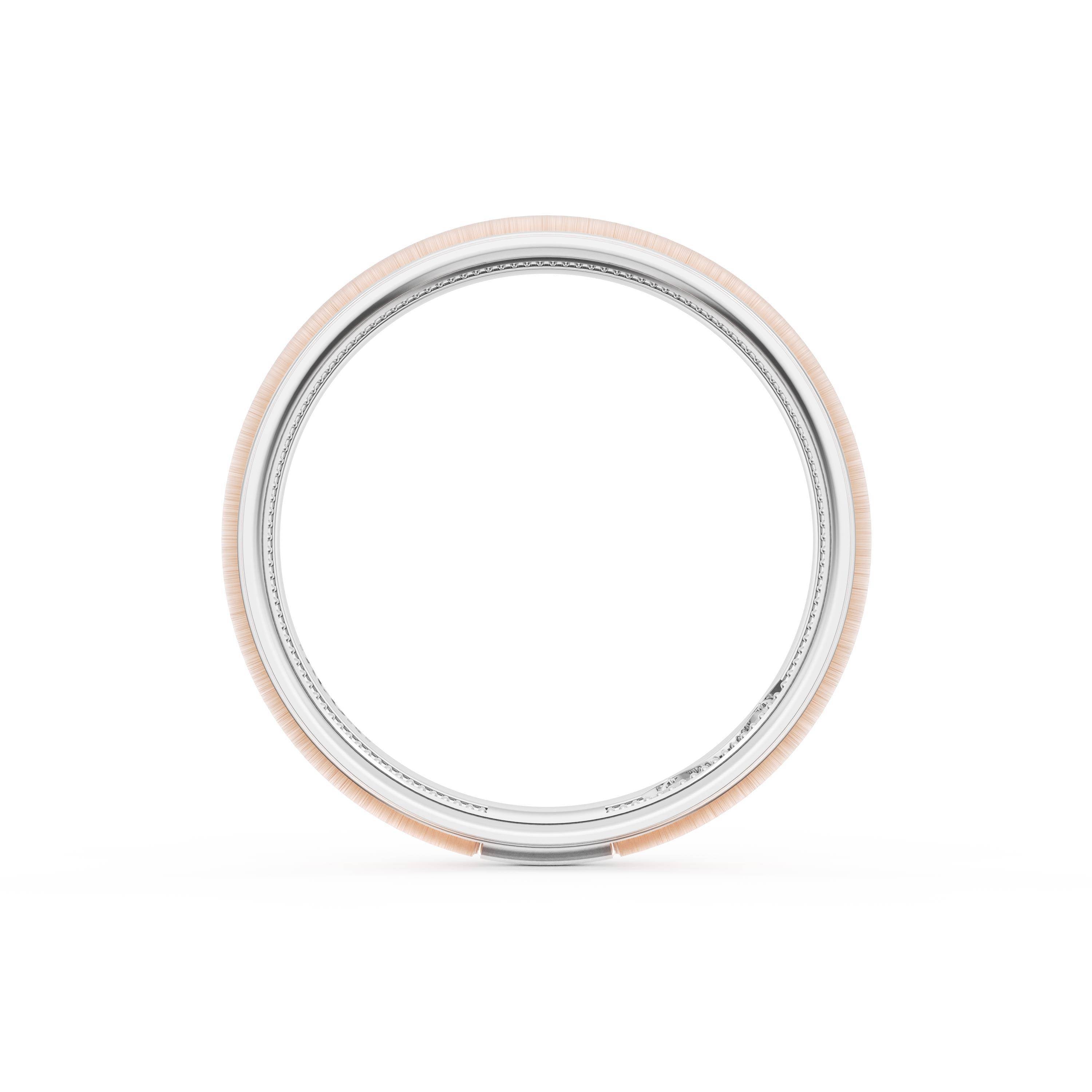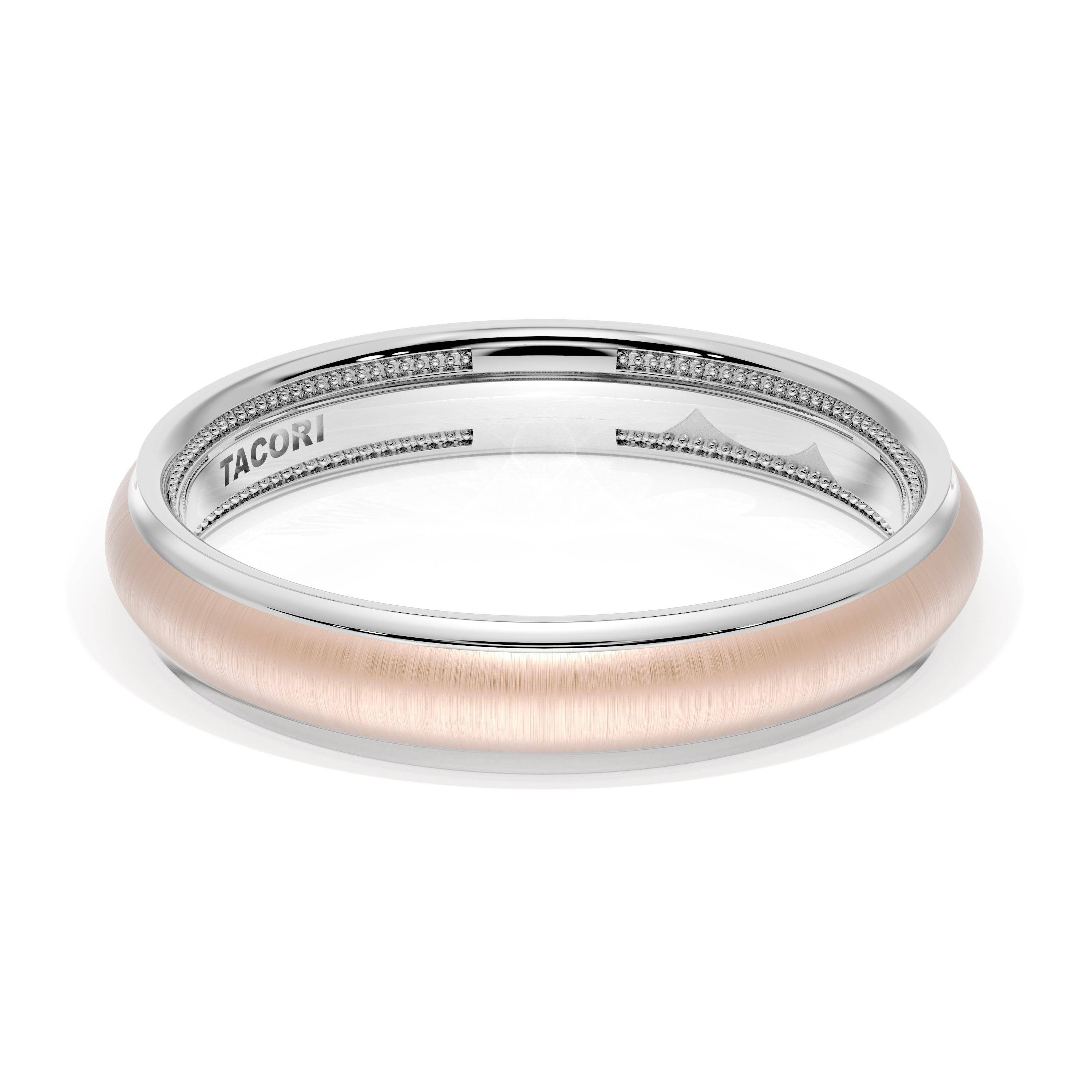 This two tone band of 18kt White Gold & 18kt Rose Gold features a gently rounded ceiling with a satin finish and milgrain detailing on the inner face.
