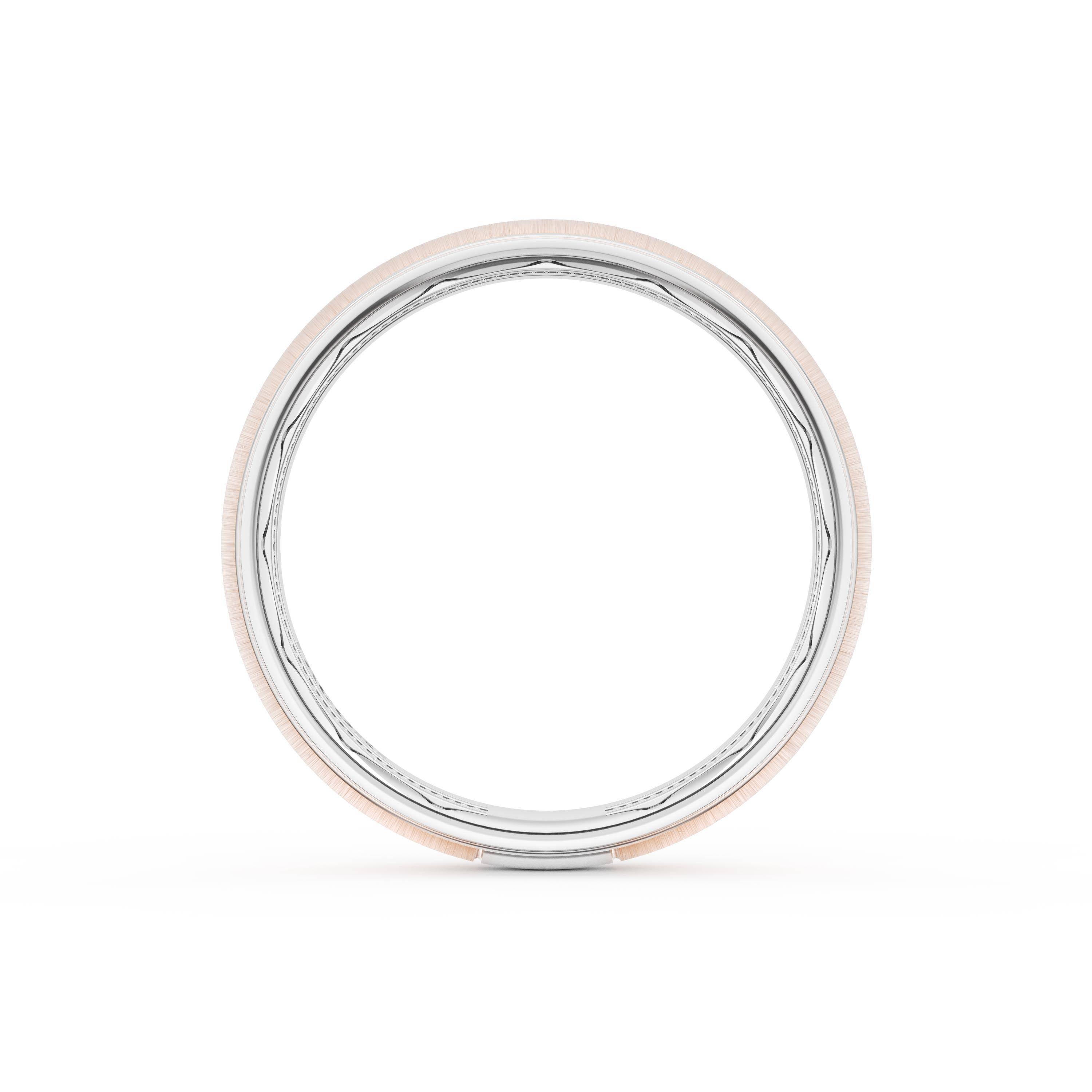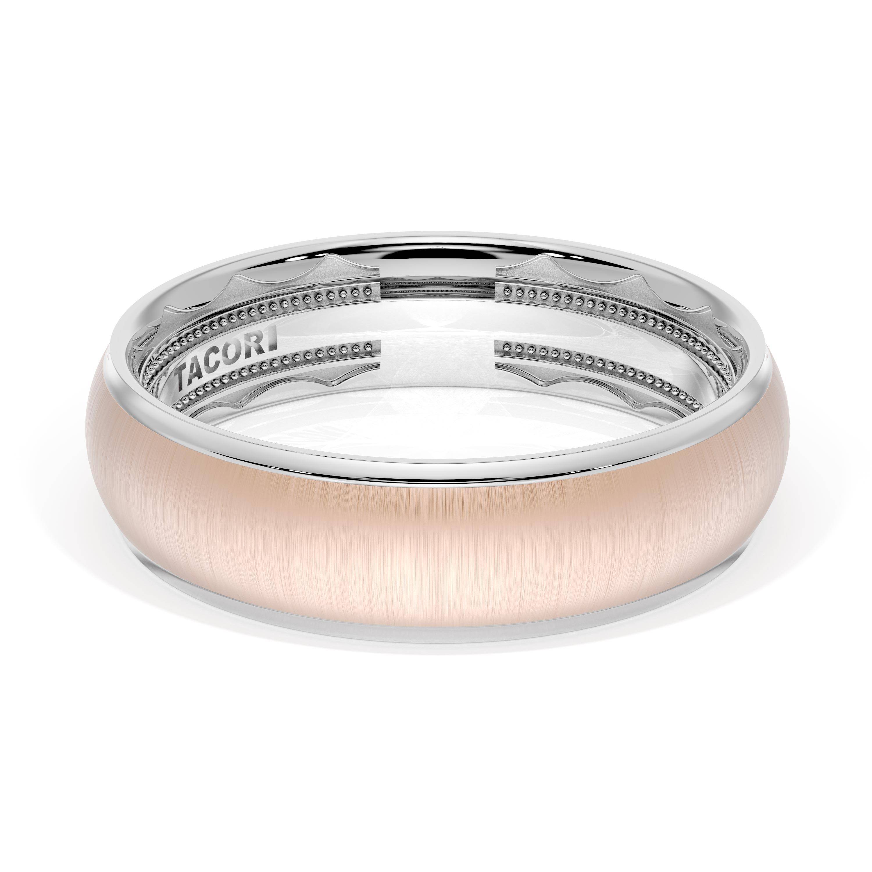 This two tone band of 18kt White Gold & 18kt Rose Gold features a gently rounded ceiling with a satin finish and milgrain detailing on the inner face.