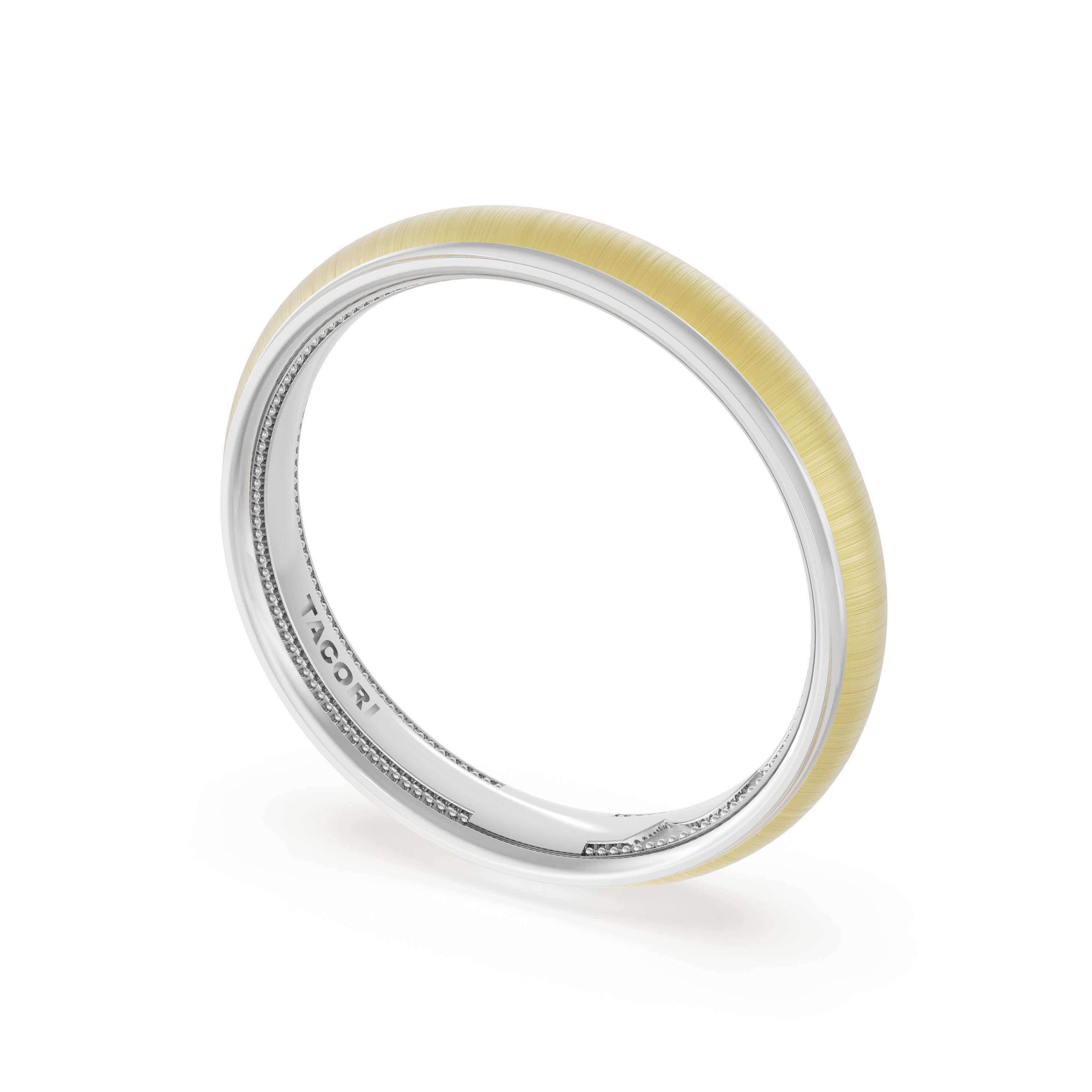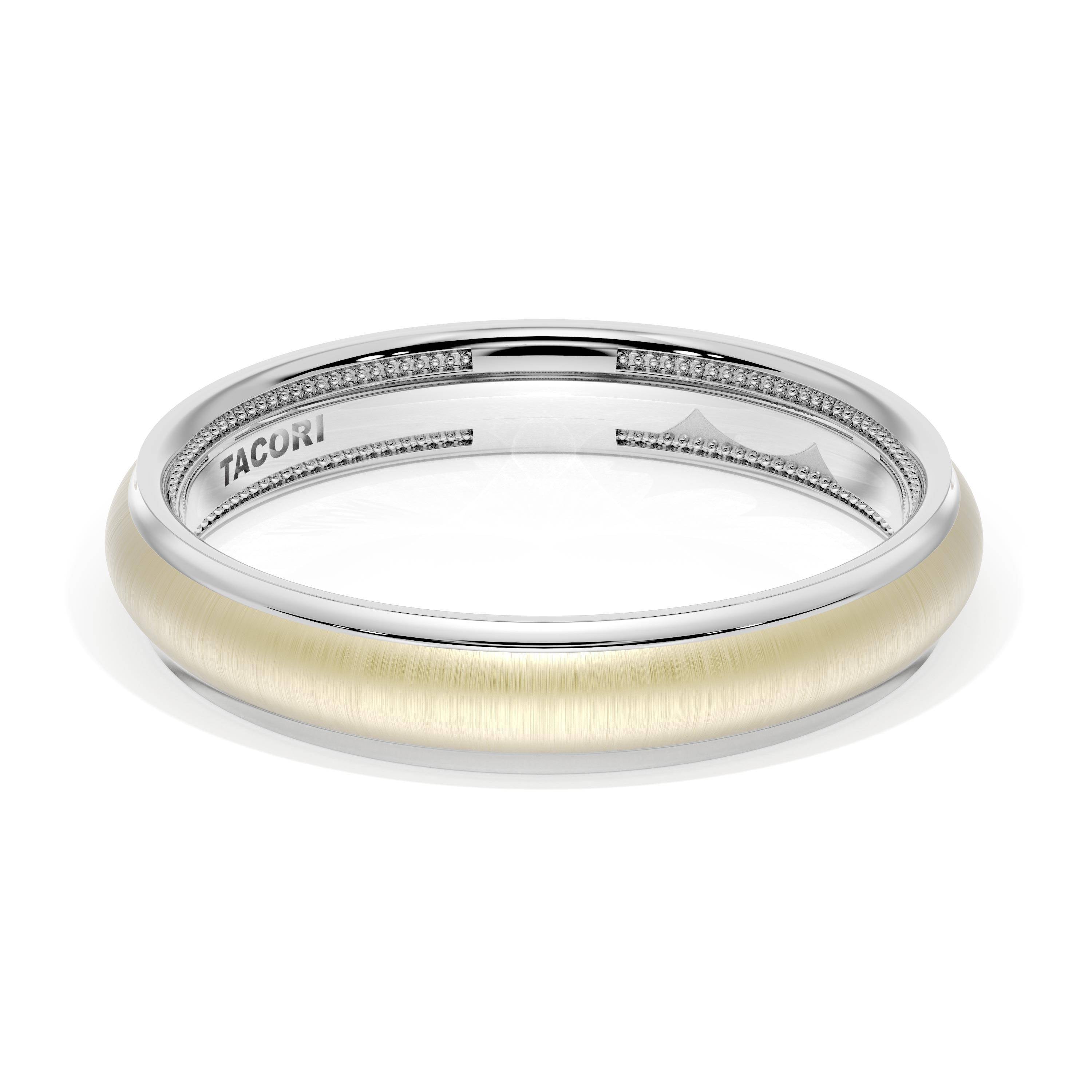 This two tone band of 18kt White Gold & 18kt Yellow Gold features a gently rounded ceiling with a satin finish and milgrain detailing on the inner face.