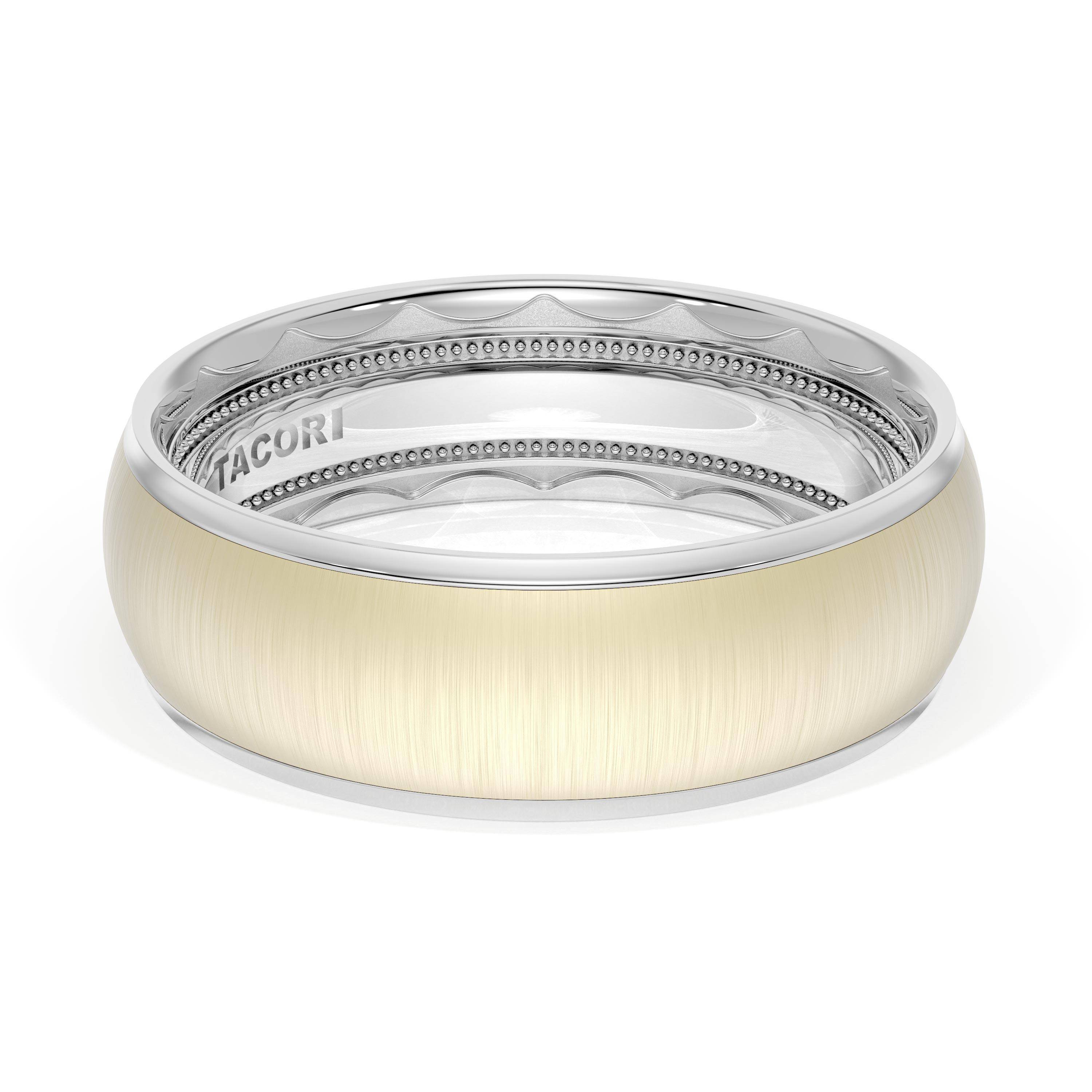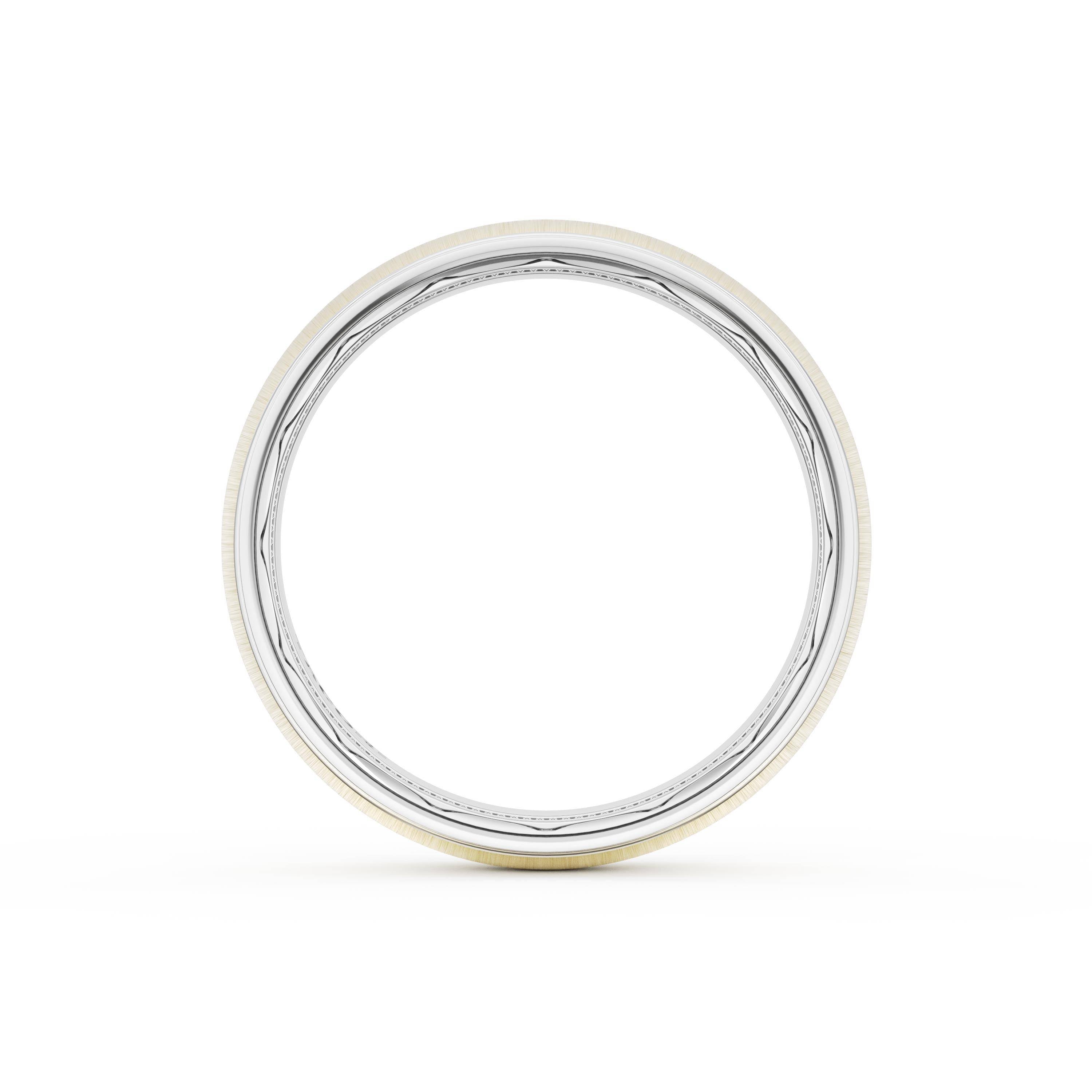 This two tone band of 18kt White Gold & 18kt Yellow Gold features a gently rounded ceiling with a satin finish and milgrain detailing on the inner face.