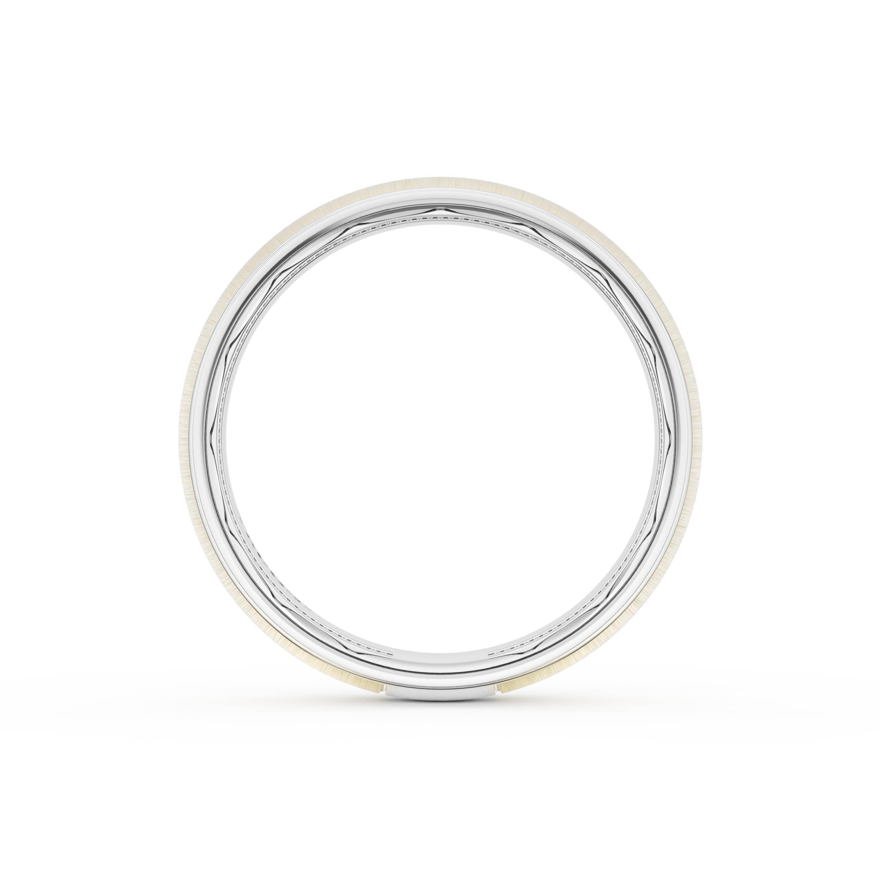 This two tone band of 18kt White Gold & 18kt Yellow Gold features a gently rounded ceiling with a satin finish and milgrain detailing on the inner face.