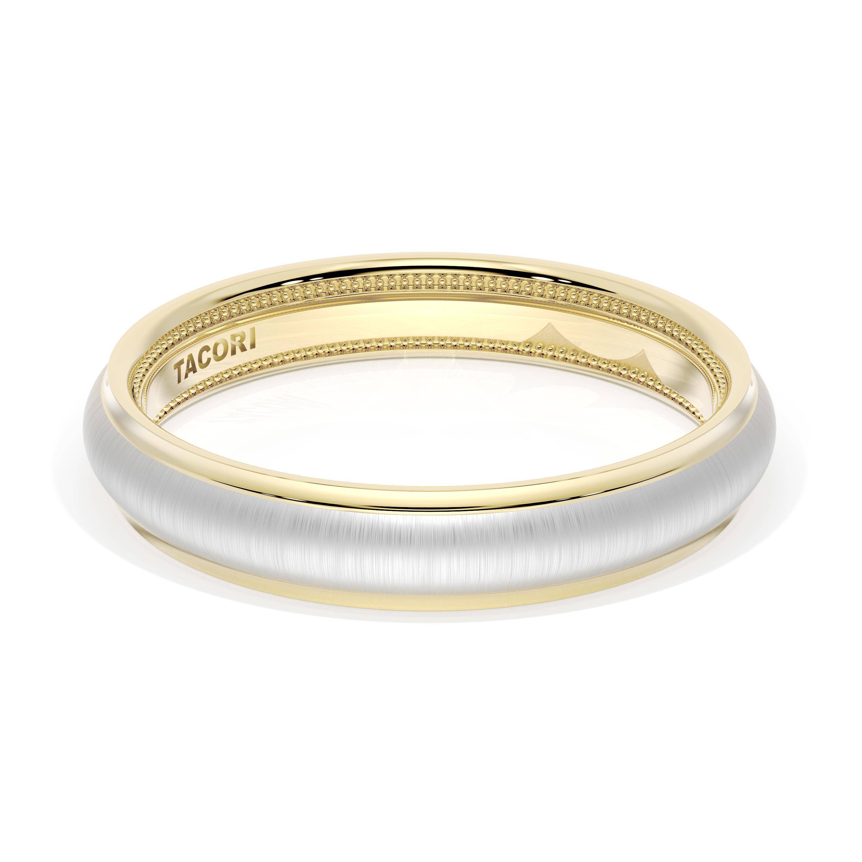 This two tone band of 18kt Yellow Gold & 18kt White Gold features a gently rounded ceiling with a satin finish and milgrain detailing on the inner face.