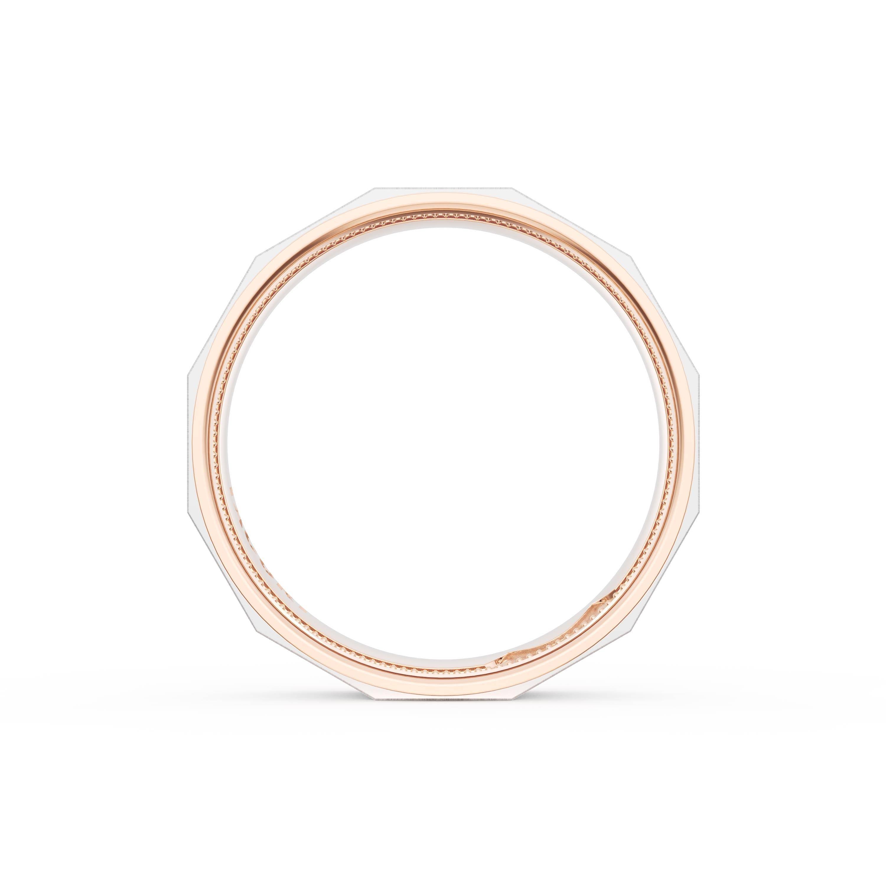 This two tone band of 18kt Rose Gold & Platinum features a geometric ceiling with a satin finish and milgrain detailing on the inner face.