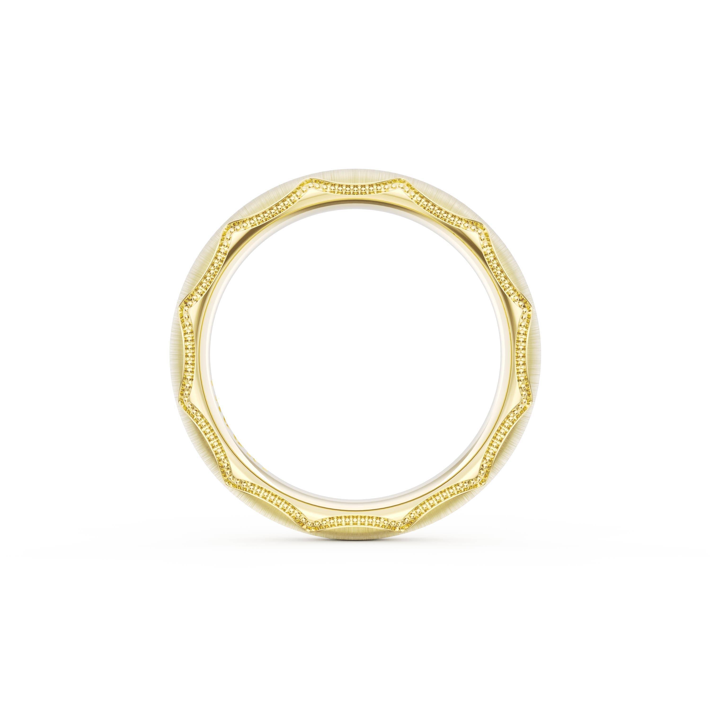 This bold and modern cigar-style 18K Yellow Gold band with clean lines gets a touch of texture from milgrain Crescent detailing on the silhouette.