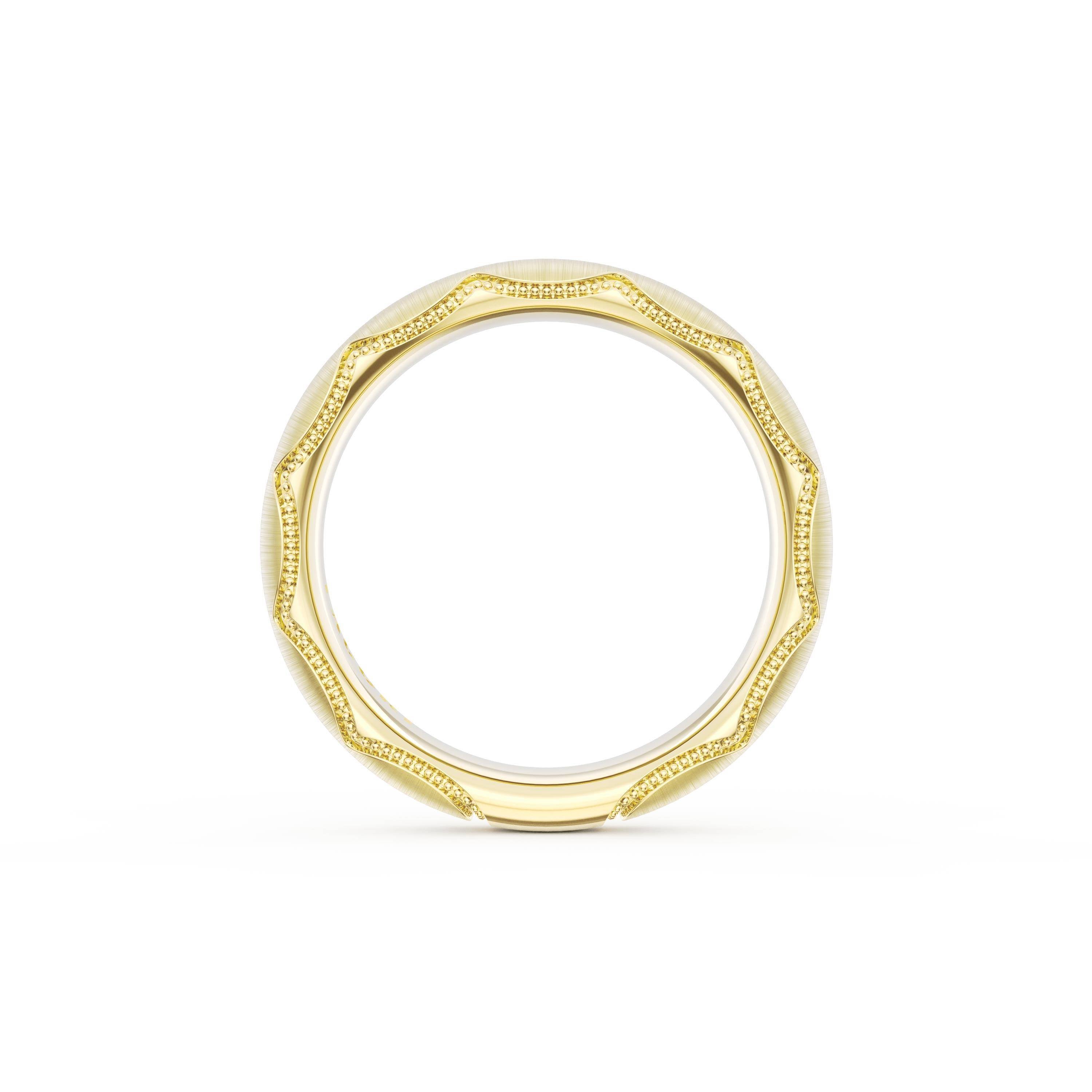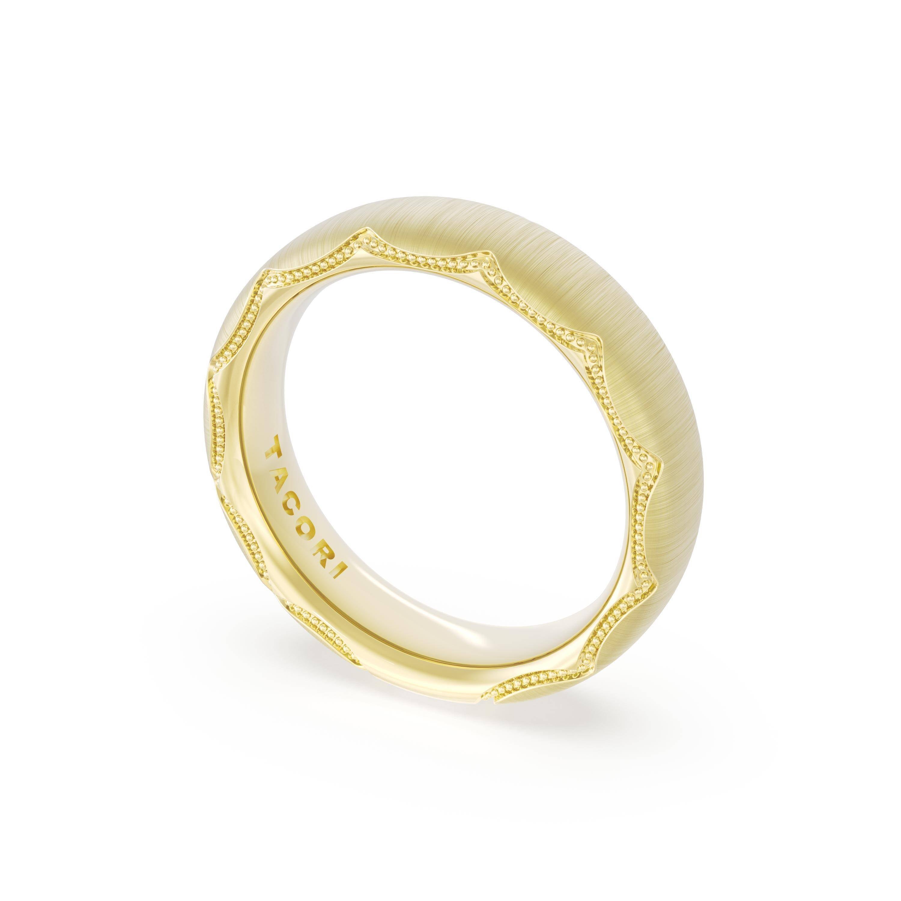 This bold and modern cigar-style 18K Yellow Gold band with clean lines gets a touch of texture from milgrain Crescent detailing on the silhouette.