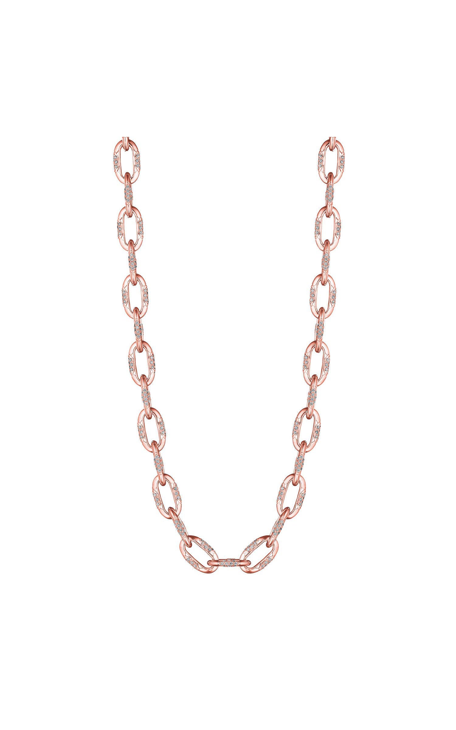 "An innovative single-cast, no solder chain of 18k gold links are decorated with ellipse-shaped patterns of brilliant round Diamonds that form the iconic Tacori crescent. This design is timeless, elegant, and showcases Tacori's unmatched artisanry."