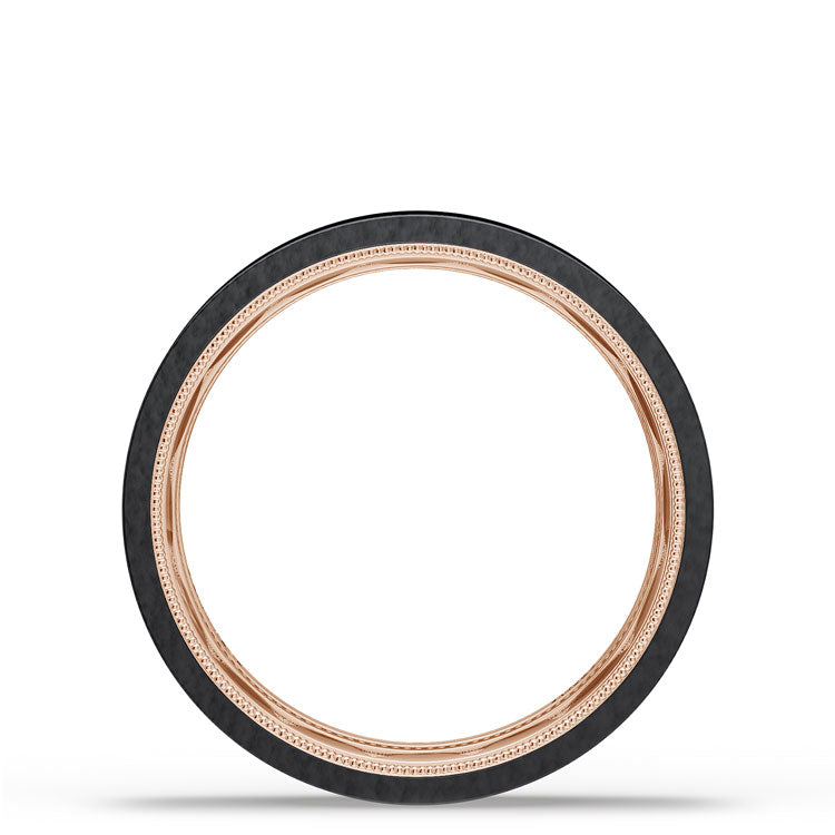 "The ceiling and inner face silhouette of two metals, Black Titanium and 18kt Rose Gold, make for an eye-catching tone-on-tone contrast. The inner face is decorated with hand-hewn milgrain, beading, and TACORI Crescent detailing. Rings are available in full and half sizes from 6-12."