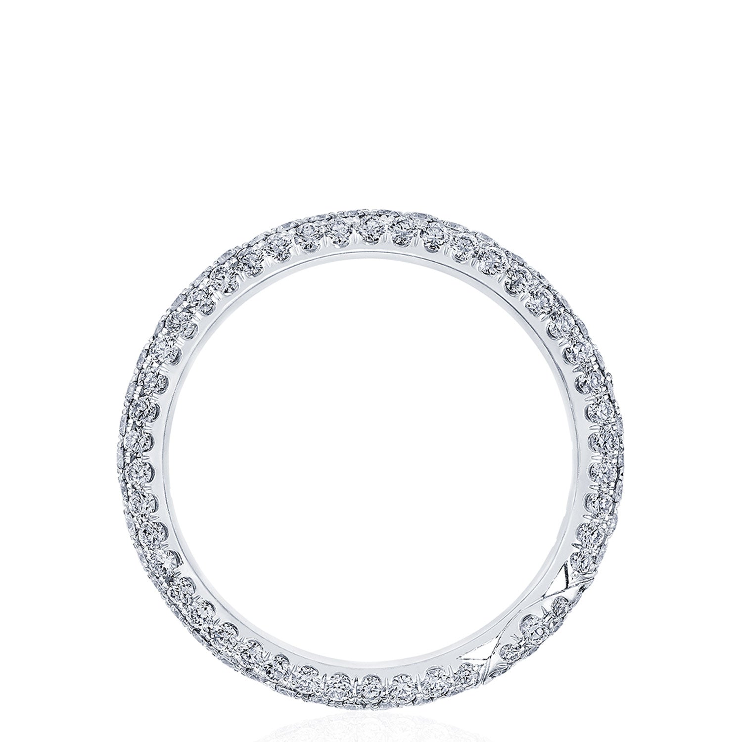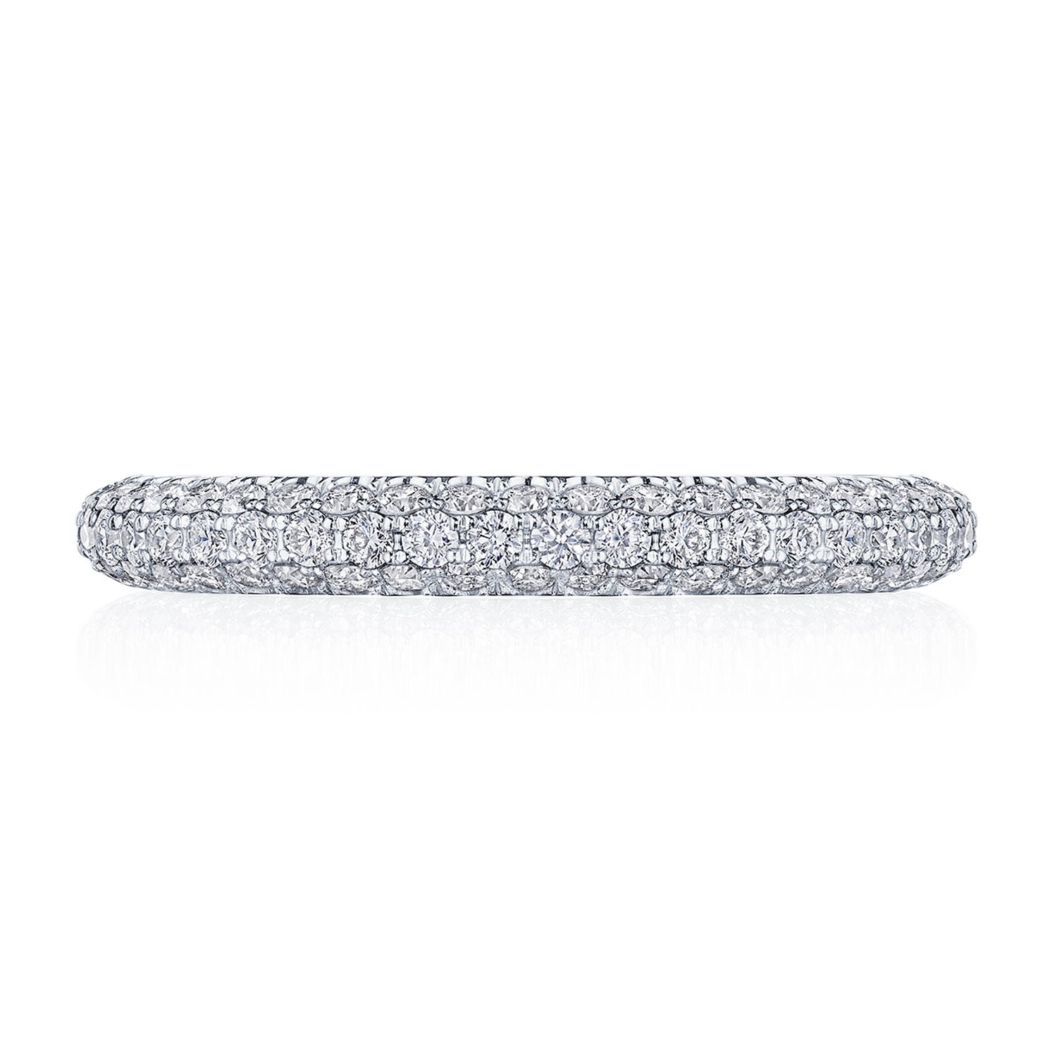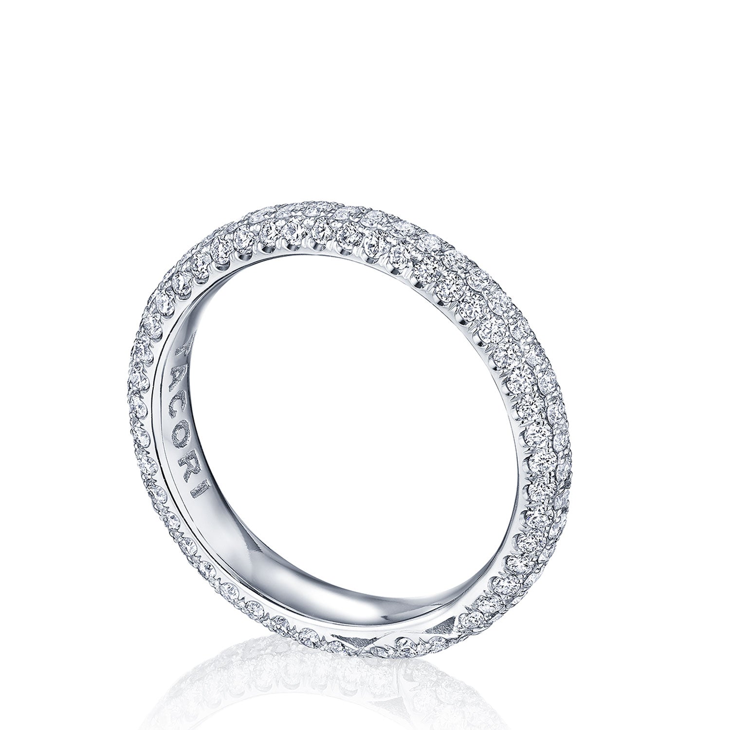 "Designed by our Founder, Haig Tacorian, this eternity wedding band features a triple row of pavé-set diamonds, all around the band. Discover the diamond-intense Tacori crescent signature."