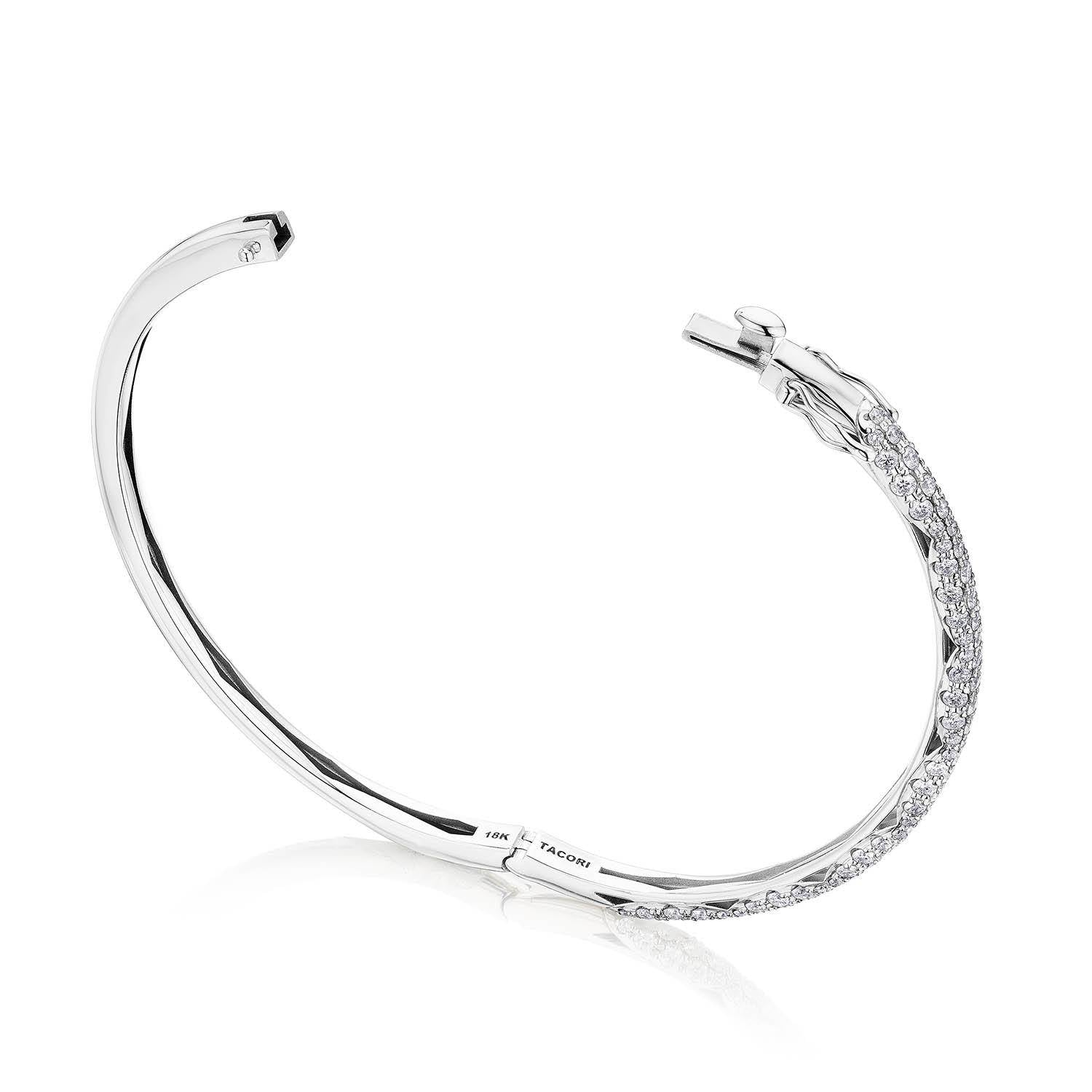 "This slim 3mm bangle features a full ceiling of pavé-set round brilliant Diamonds with eye-catching Crescent detail, set into high polish 18k White Gold."