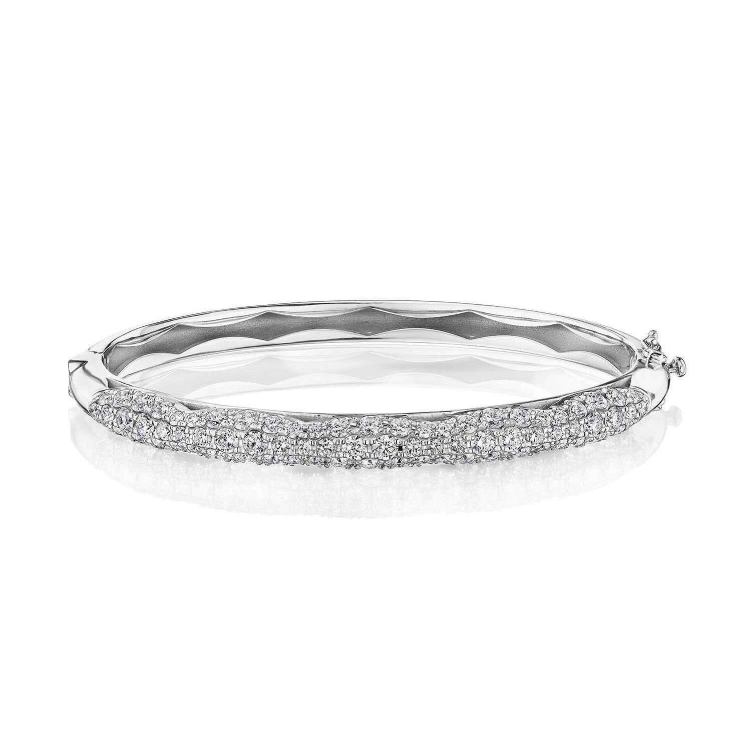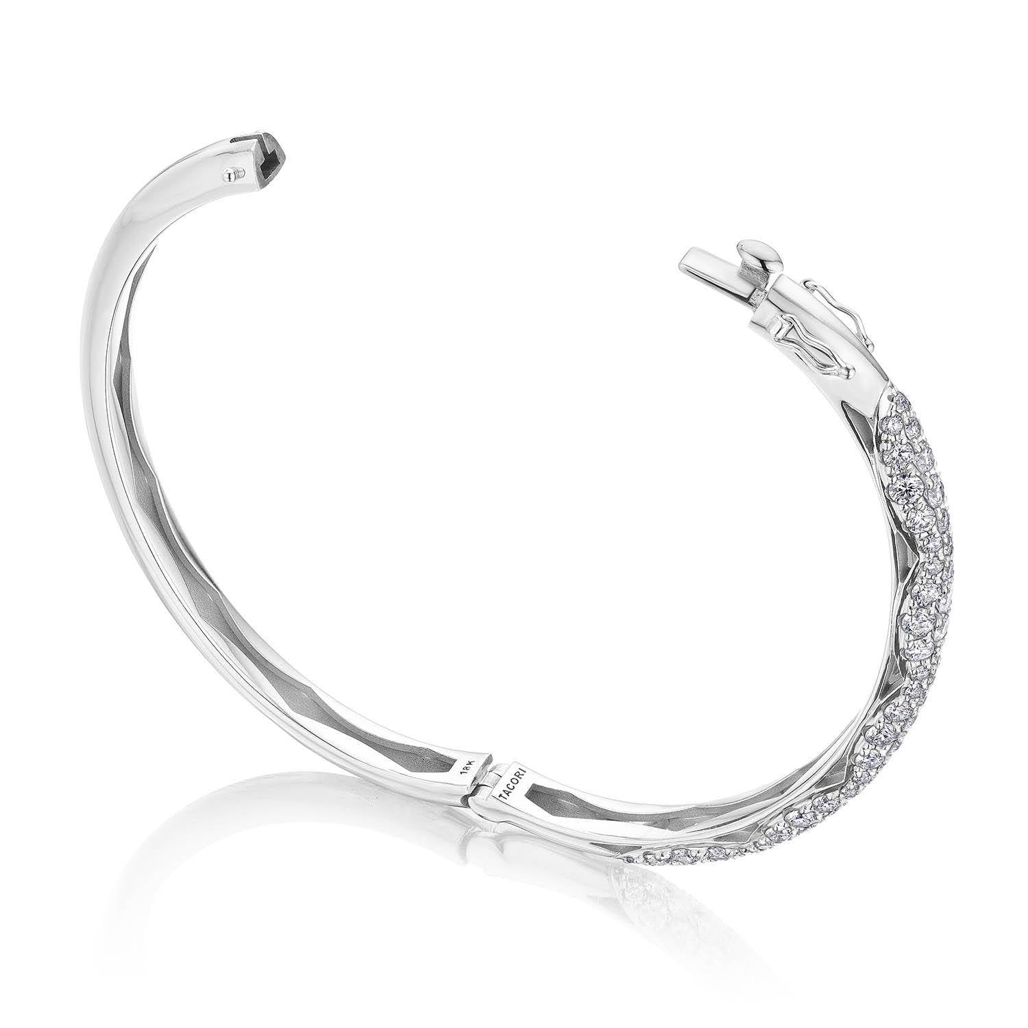 "This bold 5.5mm bangle features a full ceiling of pavé-set round brilliant Diamonds with eye-catching Crescent detail, set into high polish 18k White Gold."
