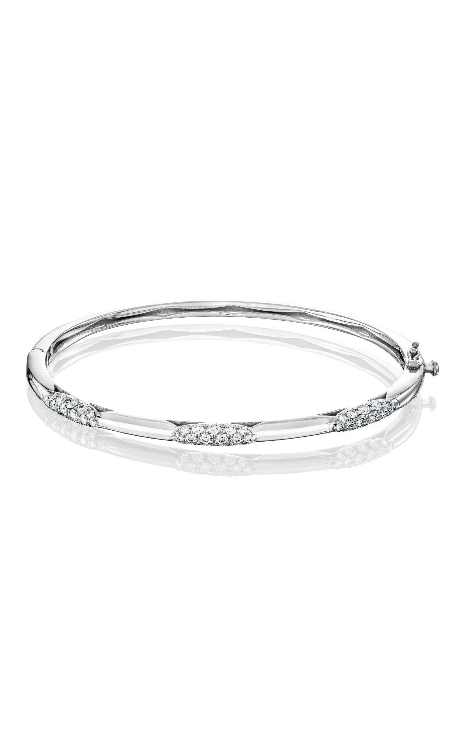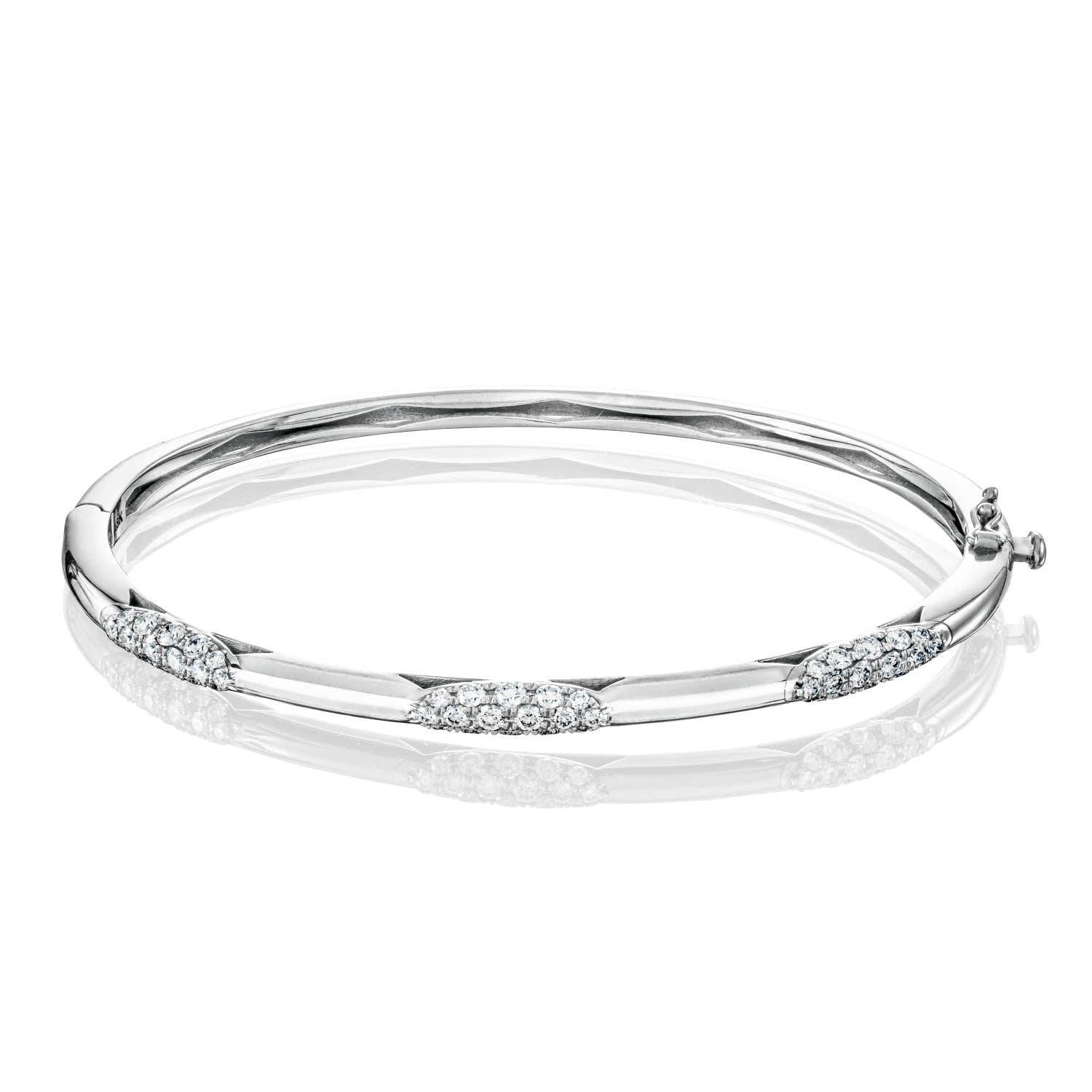 "Three ellipses formed by sparkling, Diamond-studded TACORI crescents showcase unparalleled craftsmanship. Set on a delicate band of 18k gold with interior crescent detailing, this bangle is a contemporary and elegant showstopper."