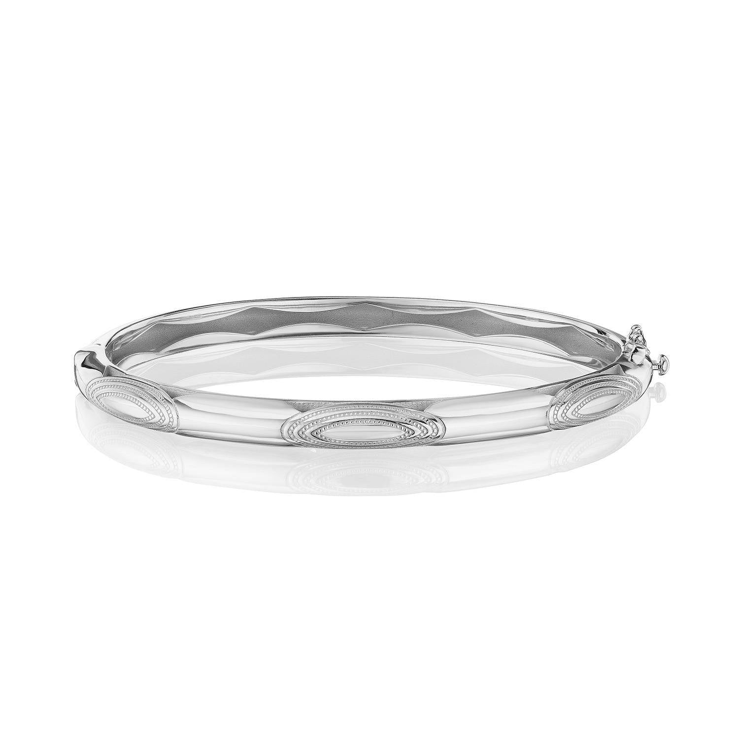 This bold 5mm bangle pulses with ellipses formed by hand-hewn milgrain. This design is set into 18k White Gold.
