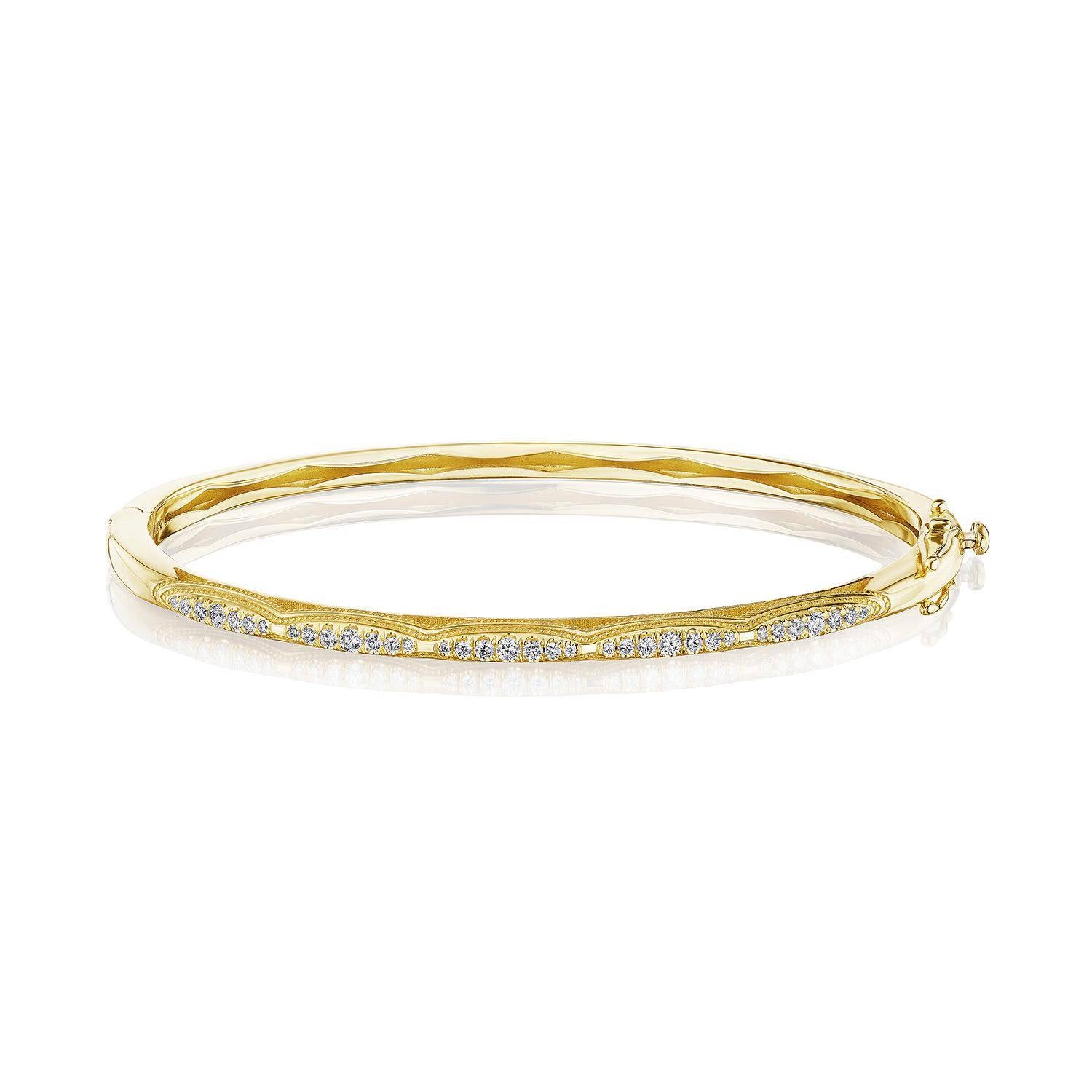 "This slim, 3mm bangle features brilliant ellipses formed by pavé-set round brilliant Diamonds and hand-hewn milgrain. This design is set into high-polish 18k Yellow Gold."