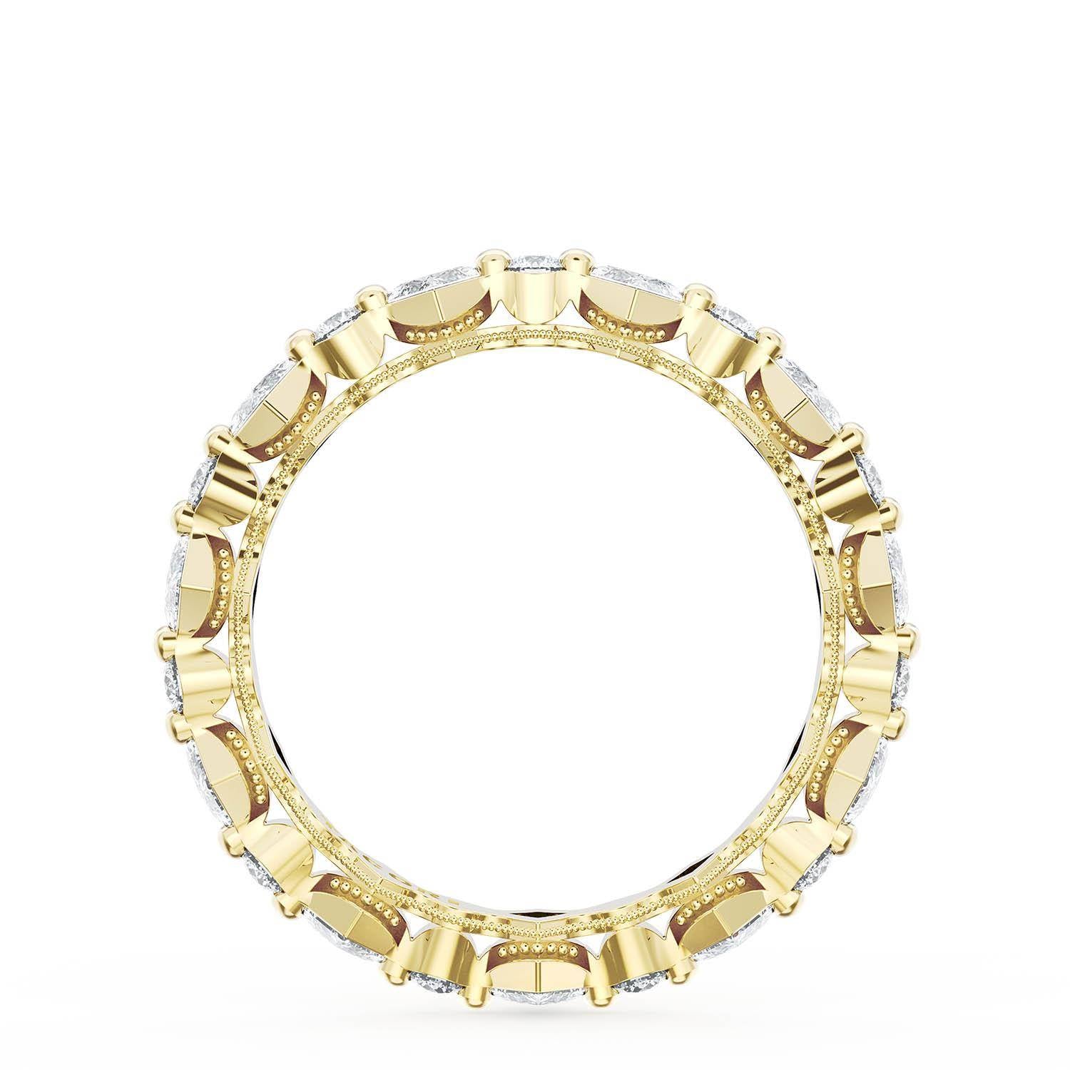 Alternating carré and round brilliant diamonds are bezel set into a high polish 18kt Yellow Gold band. Hand-hewn beading and meticulous milgrain add texture to the inner face silhouette.
