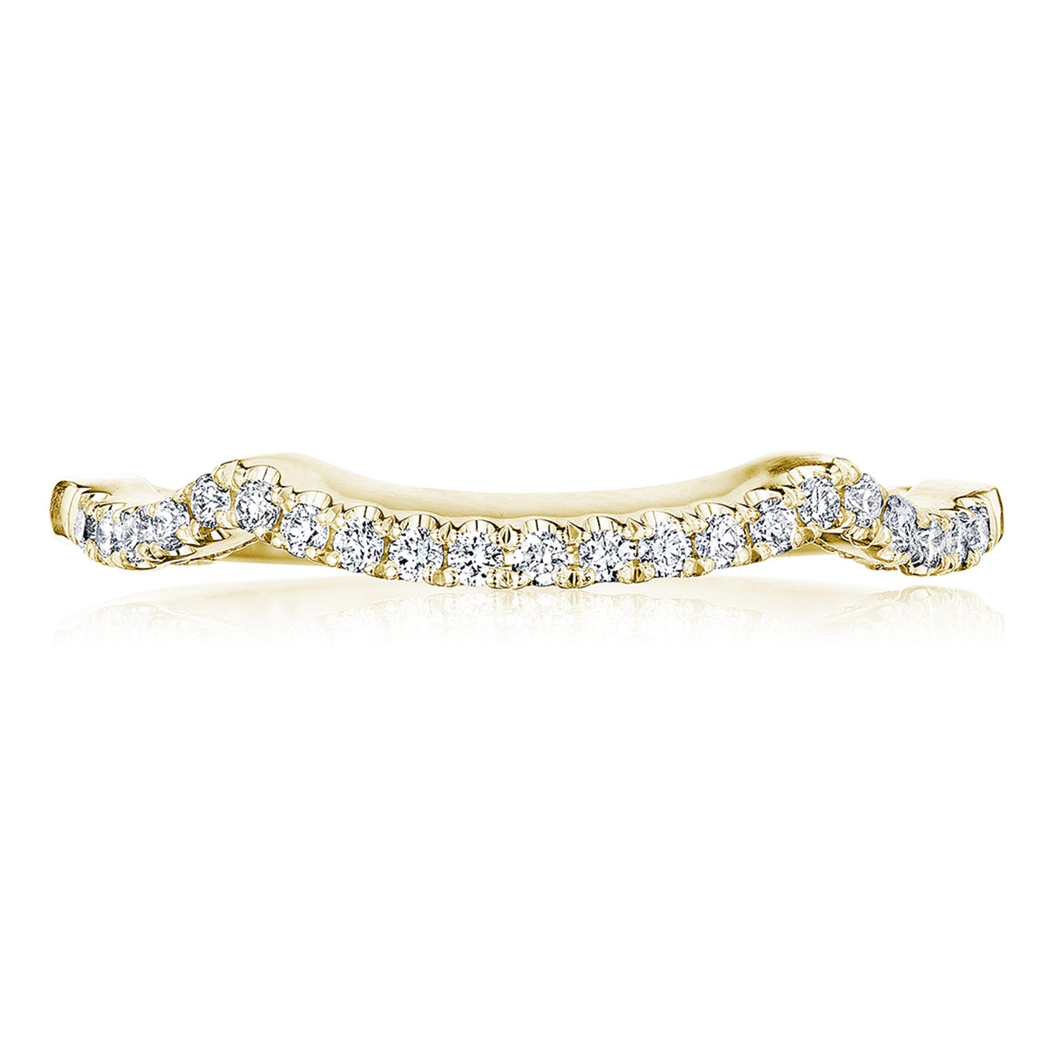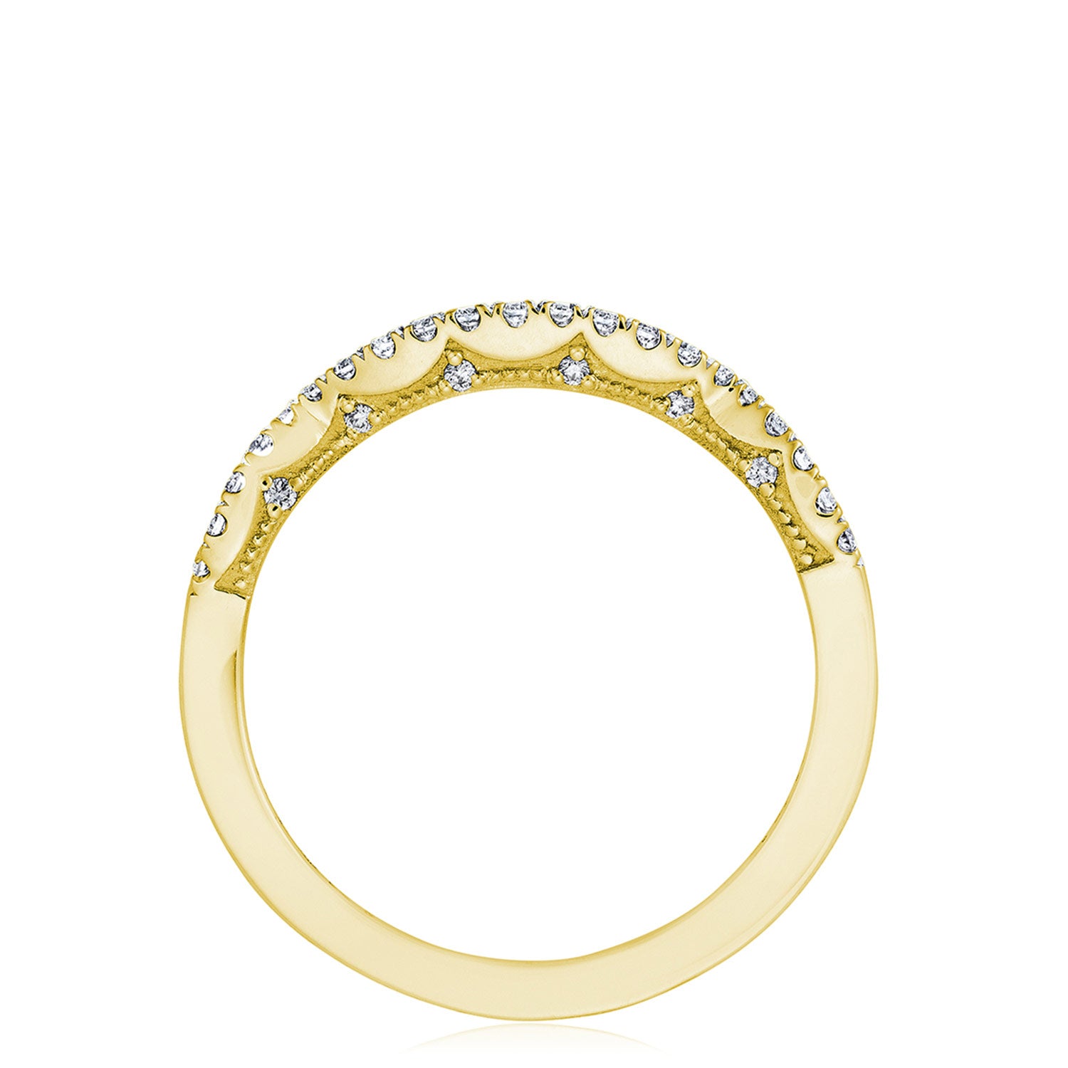 "Less metal, means more scene-stealing diamond action. A round cut diamond solitaire rests gently on a diamond band with french pavé, revealing more diamond than metal. This ring features the Coastal Crescent inner face with pinpoint diamond details for a truly regal look."