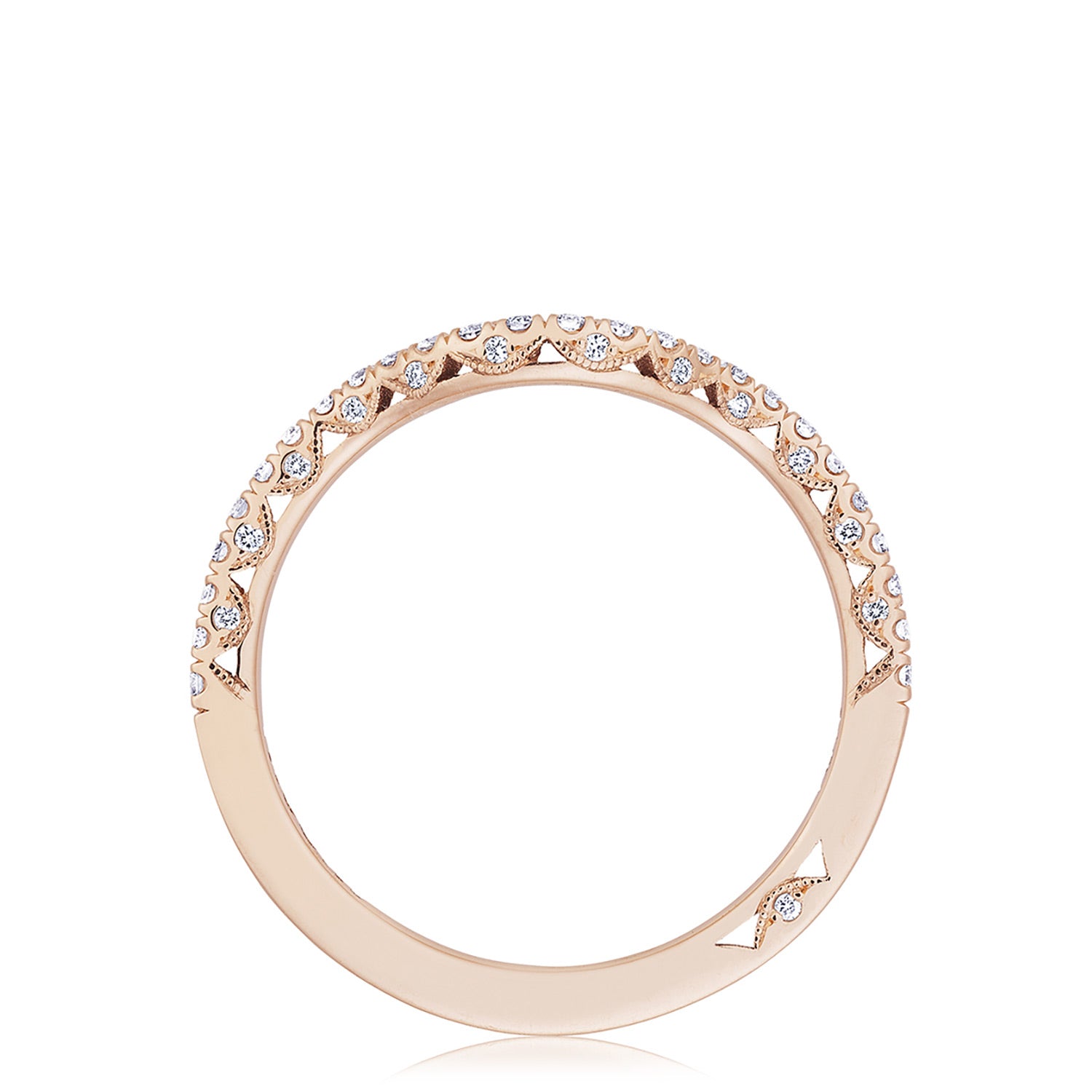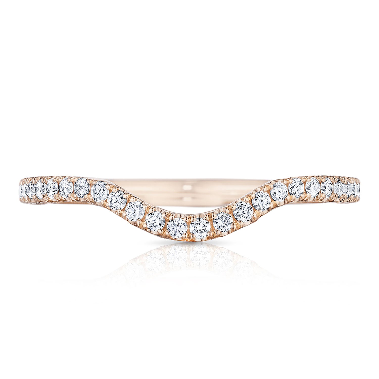 "Wave hello to our newest wedding band shape, sure to fit the Tacori Bride who's looking for a unique and unconventional twist to the traditional wedding band. pavé set diamonds curve halfway round a 18kt Rose Gold band. Worn delicately underneath your engagement ring or on top for dramatic effect, this curved ladies band truly bends the rule in wedding style."